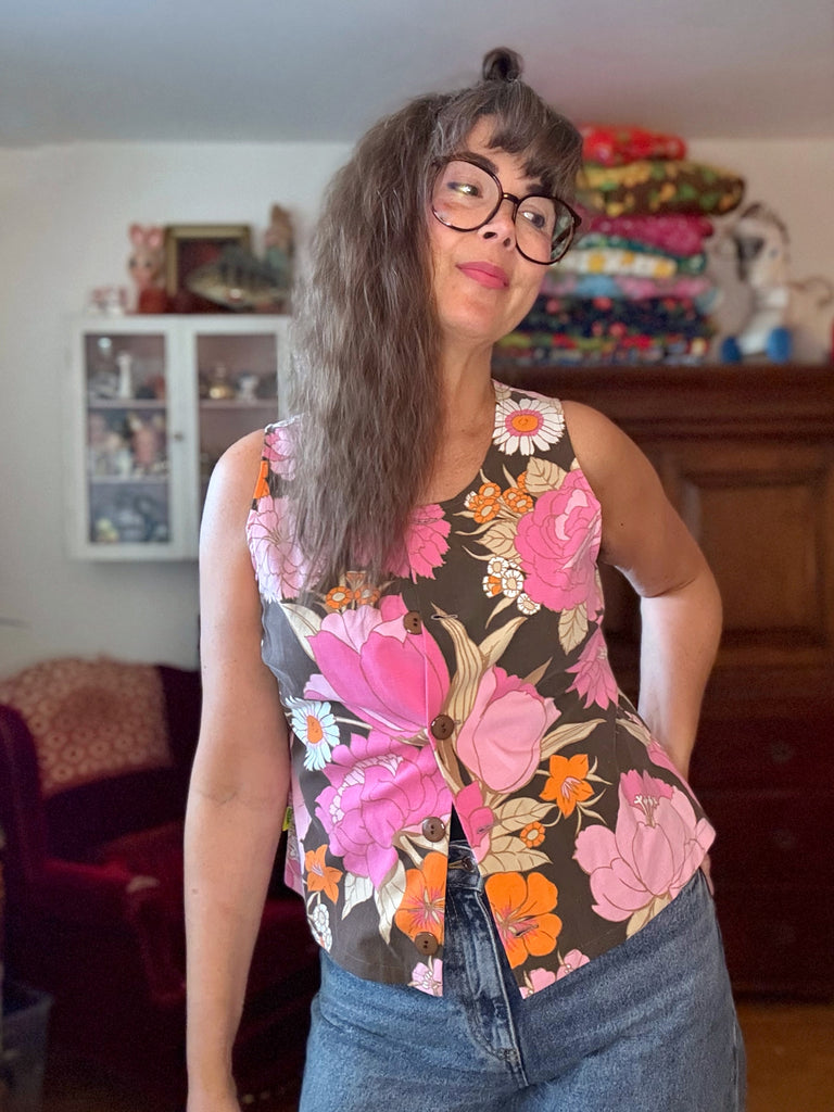 Vintagetyg i bomull med blommor i rosa och orange på en brun botten. Så fint!