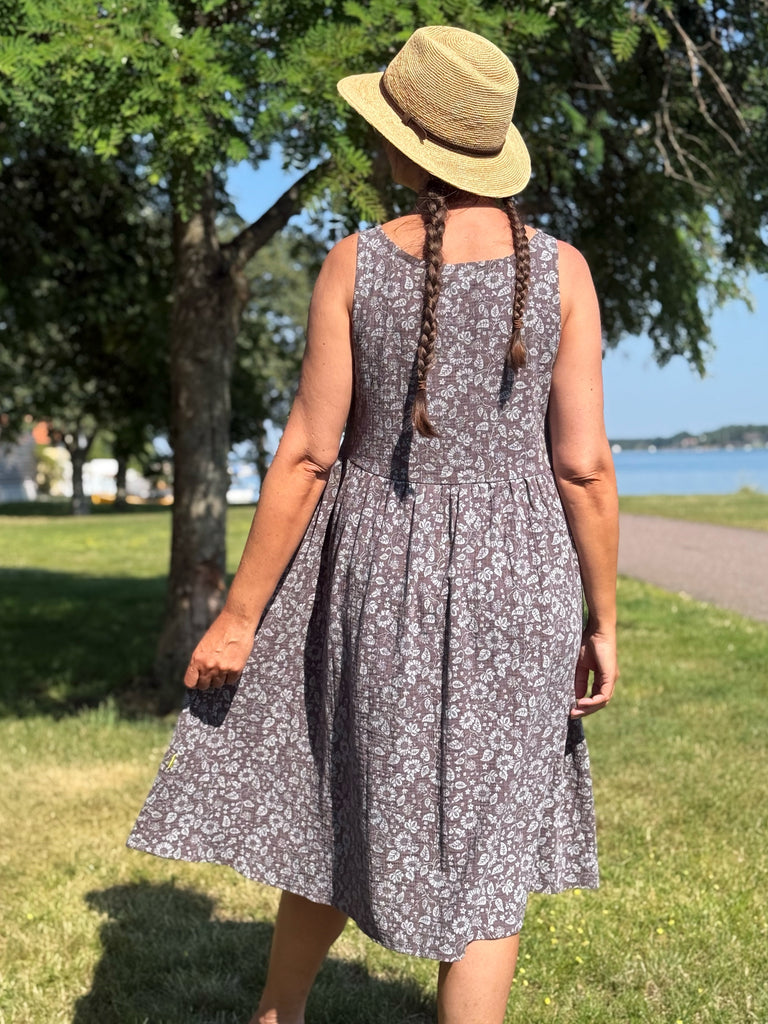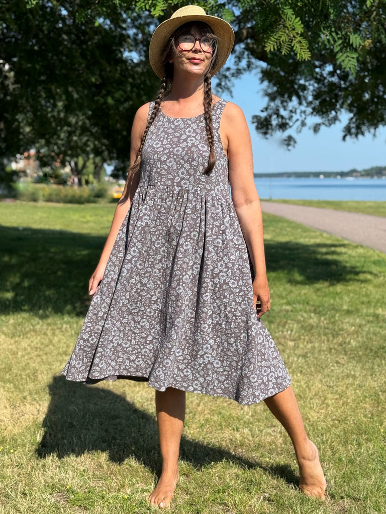 Midilängd på kjolen, livet är avskuren under bysten, dolda fickor i sidorna och en ganska hög urringning.