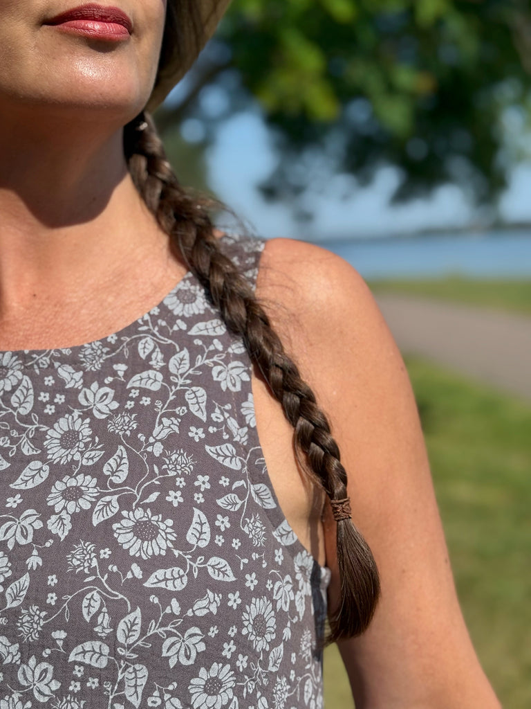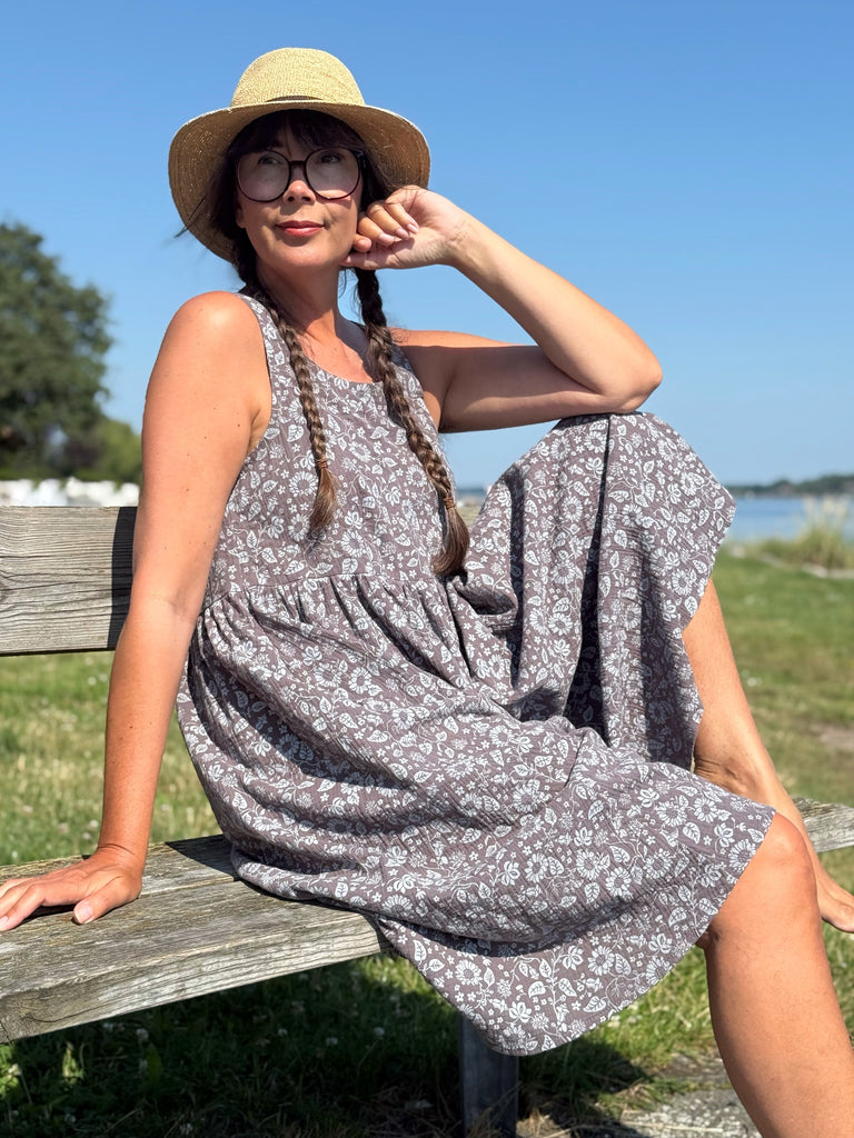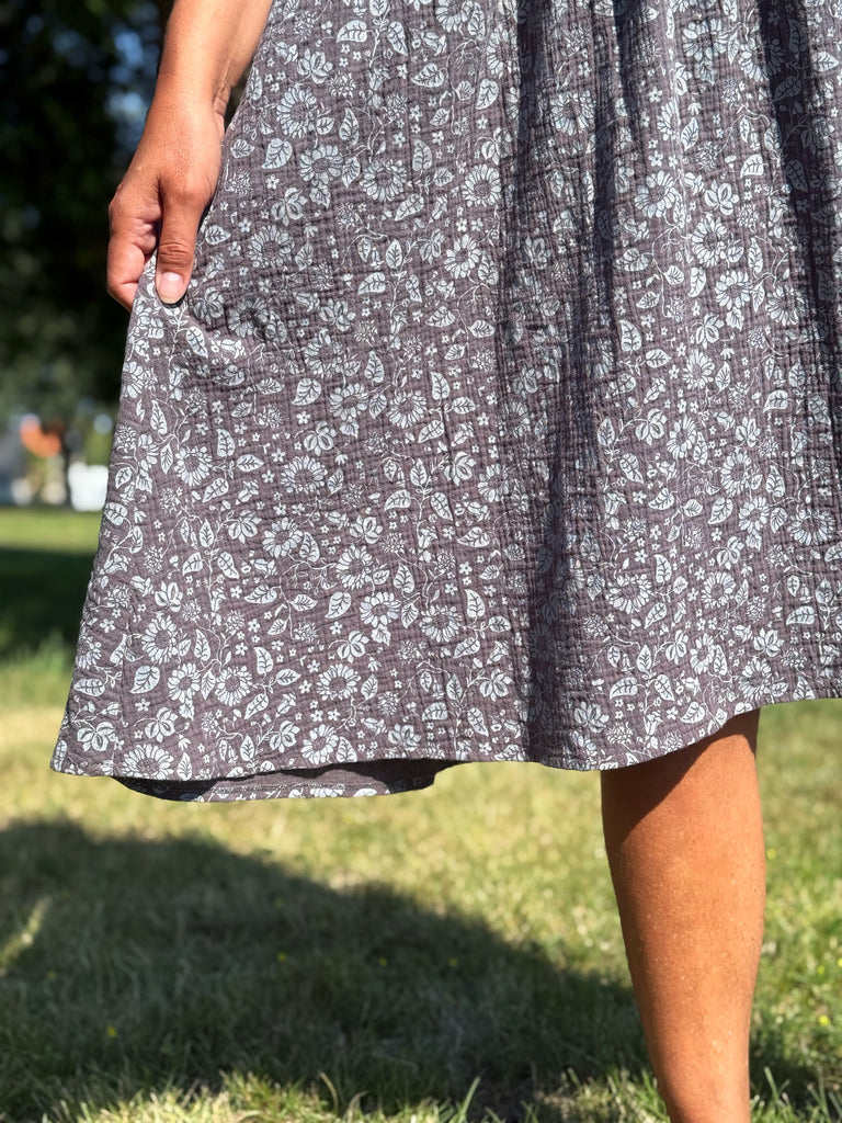 Grå botten med ett blommönster i grått. Bomullsmuslin har en härlig struktur och är oerhört mjukt och bekvämt att bära. Blir mjukare ju mer du tvättar det.