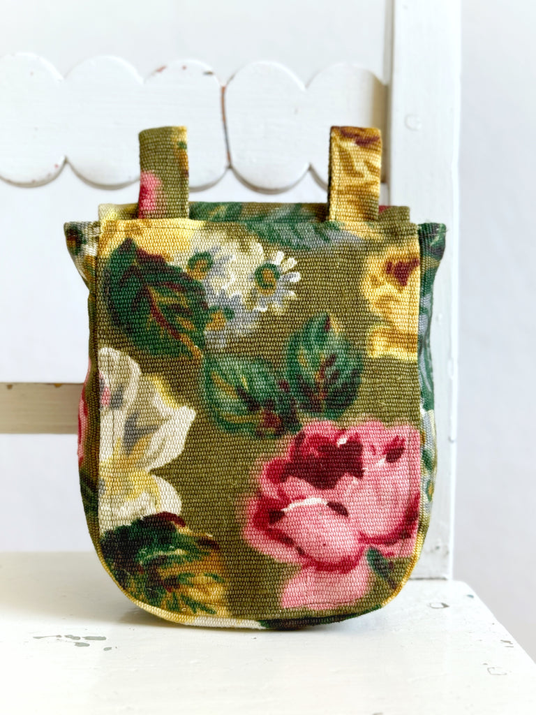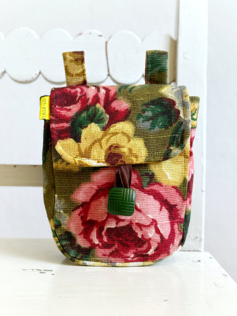 Mina bältesväskor är sydda av vintagetyger eller andra tyger som blivit över efter produktion och är helt unika i sitt slag. De har en fin stadga och är fodrade med bomullstyg. Stängs med en vacker knapp och en liten ögla.