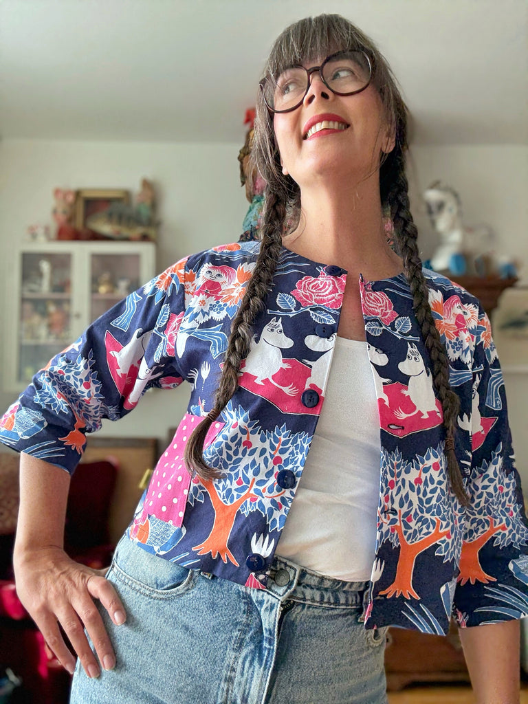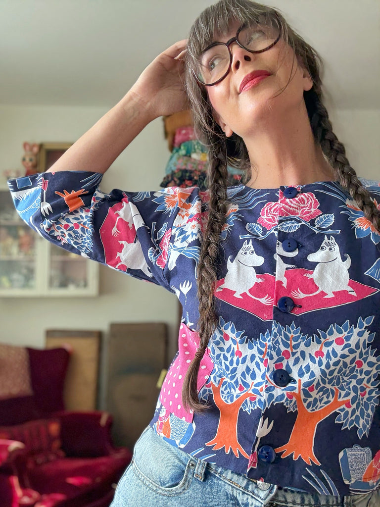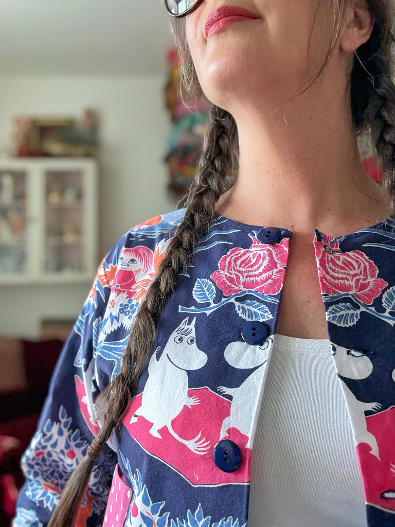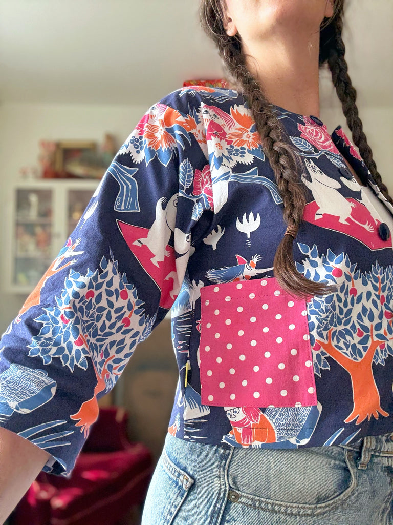 Den här är sydd av ett återbrukat bomullstyg med Mumin på. Mörkblå botten med kompisar från Mumindalen i cerise, blått, orange och vitt.. Matchas med en cerise ficka med vita prickar.