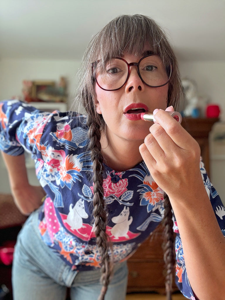 Jag på bilden är 177 cm lång och väljer alltid stl M i mina Lille-Lo kläder. På bilden har jag en blusjacka i stl S/M