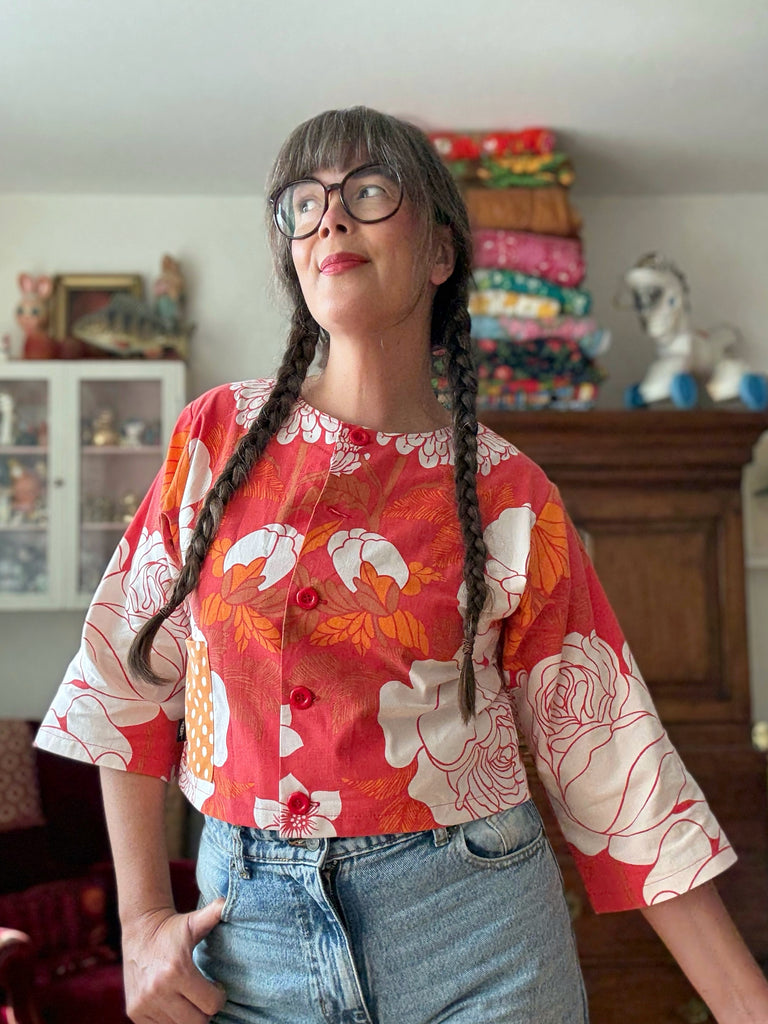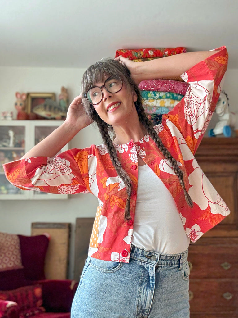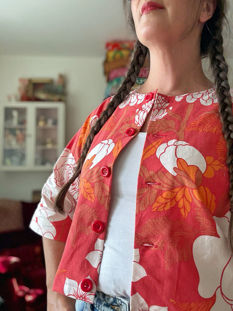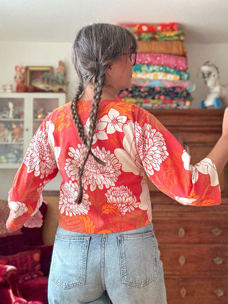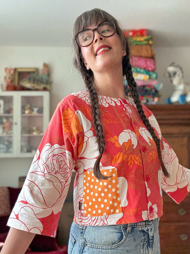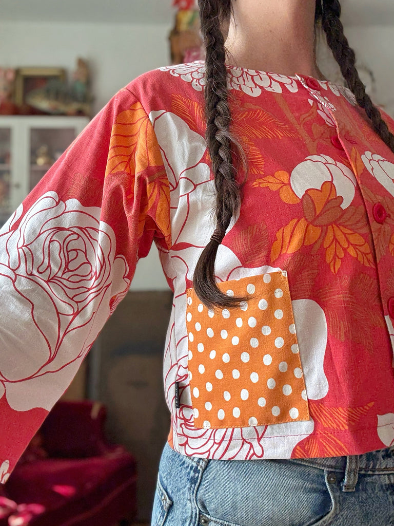 Den här är sydd av ett bomullstyg från 70-talet. Röd botten med orangea, röda och vita blommor. Matchas med en orange ficka med vita prickar.