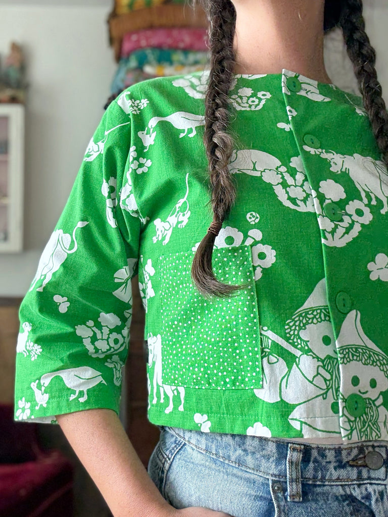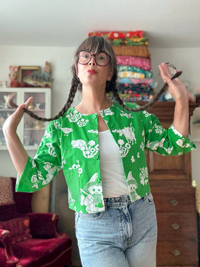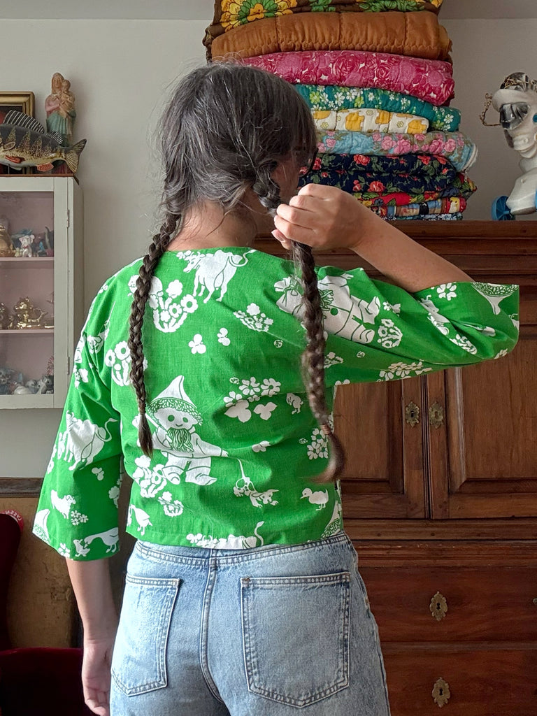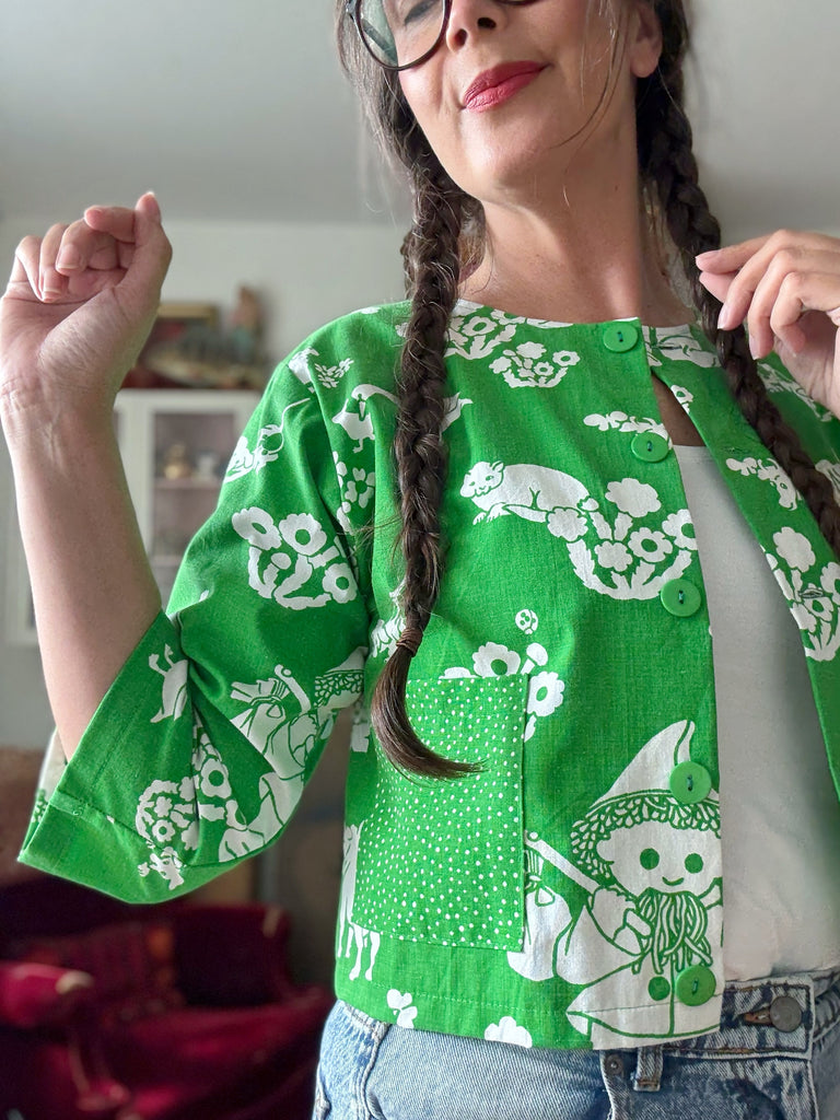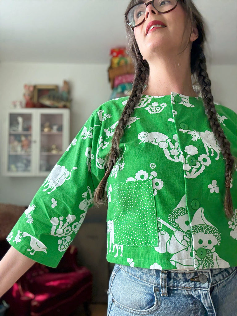 Den här är sydd av ett bomullstyg från 70-talet som jag tror du känner igen. Allas våran John Blund! Grön botten med vitt mönster. Matchas med en grön ficka med vita prickar.