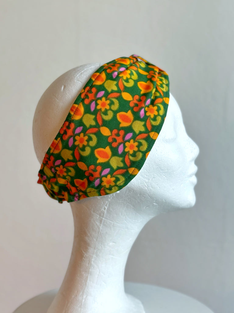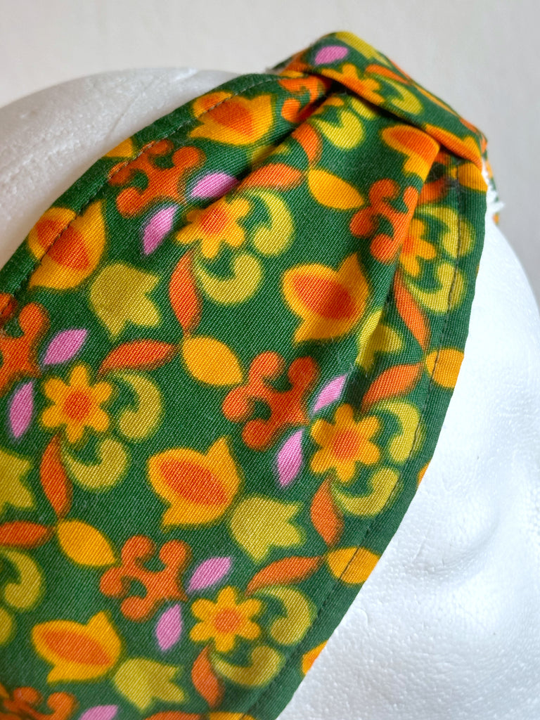 Detta pannband är i så fint och känns lite folkloristisk. Grön botten med ett mönster i orange, röd, gul och rosa.