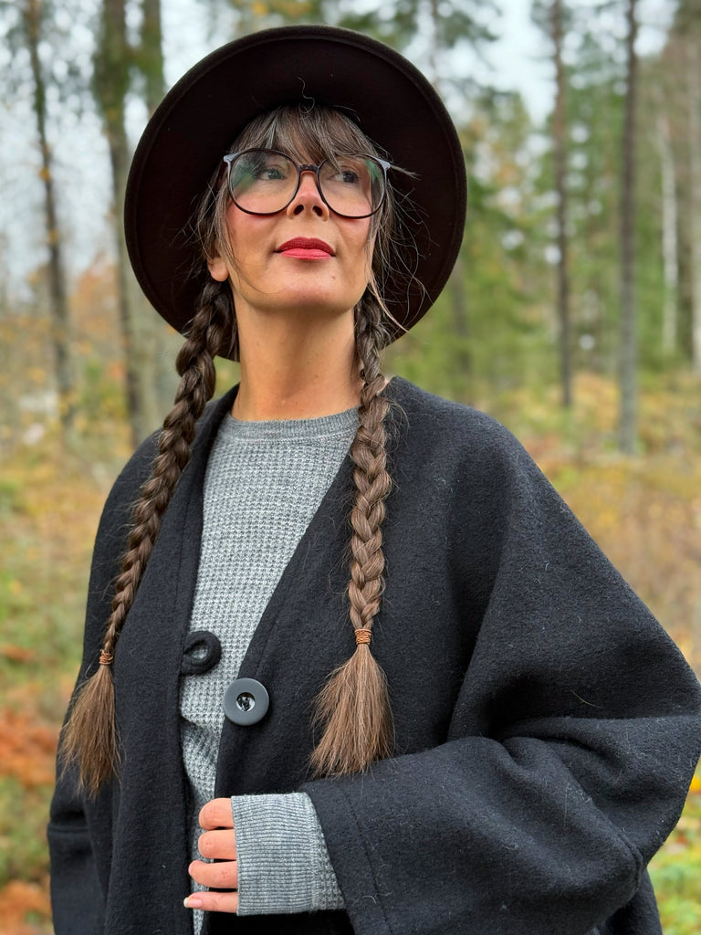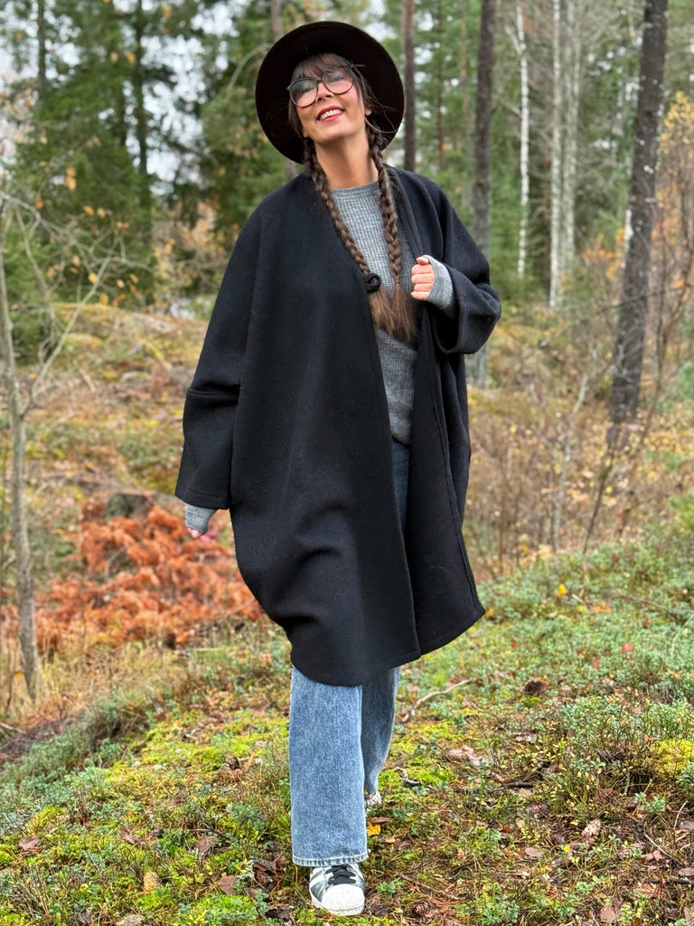 Svart ullkappa i kaftanmodell