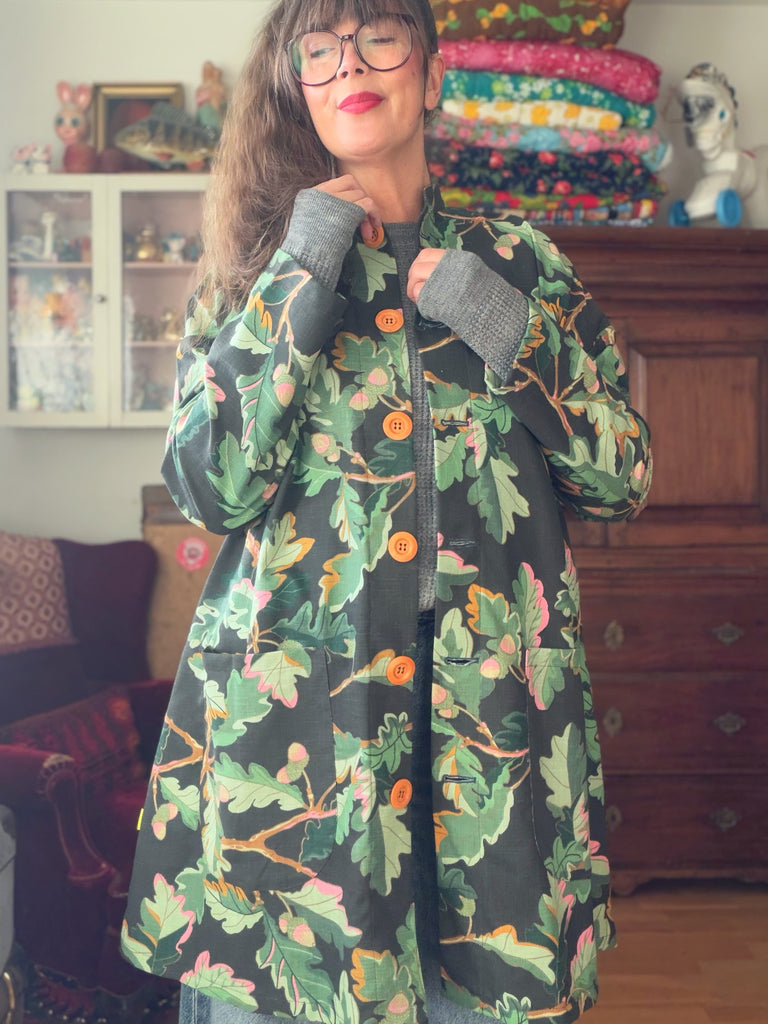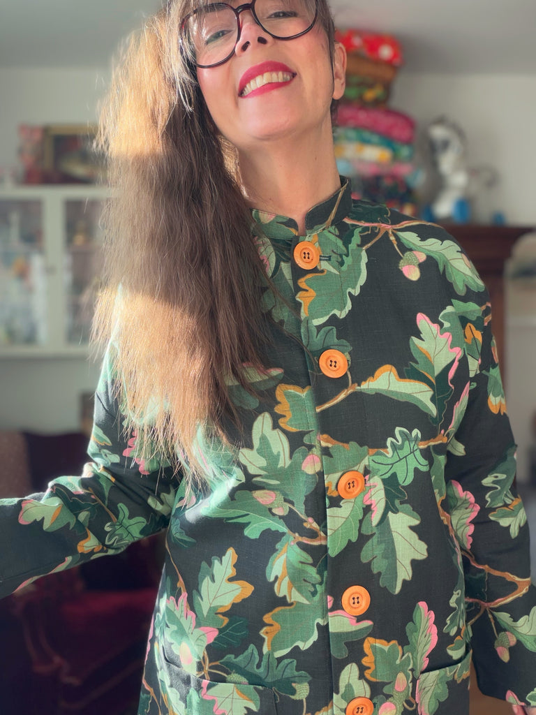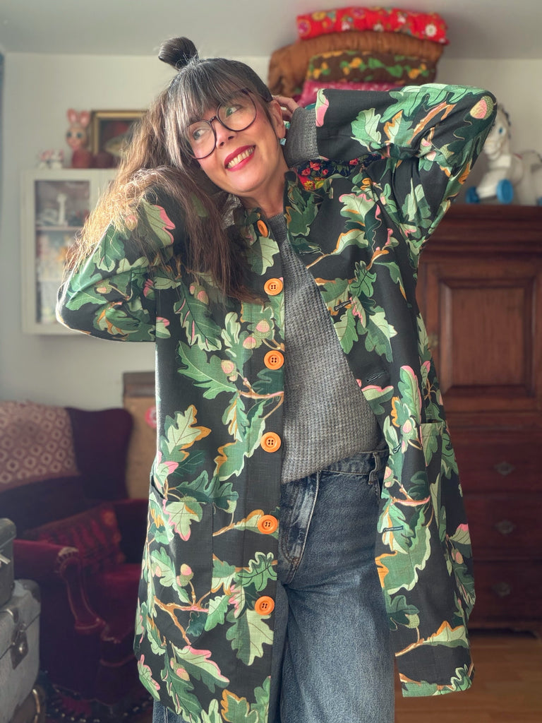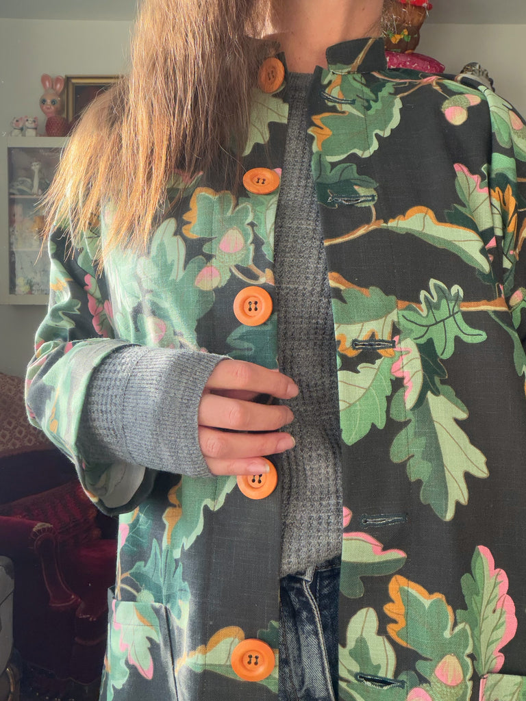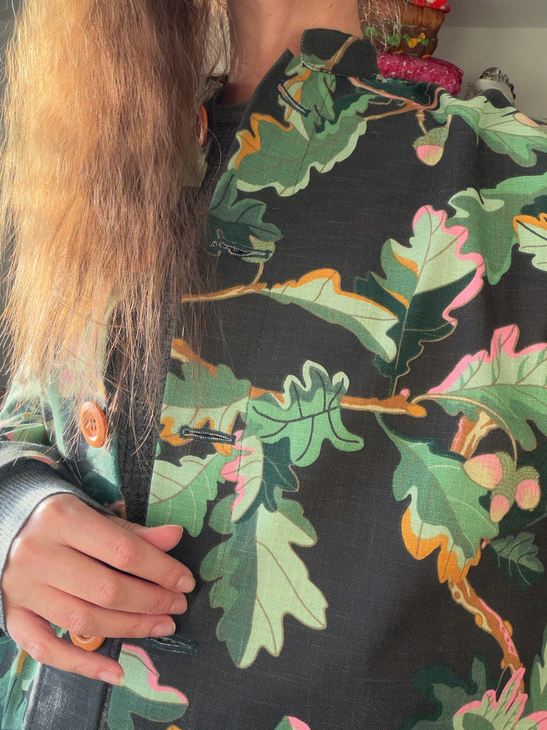 Eklöv och ekollon på en mörk botten. Tyget är återbrukat och jag tror att det är bomull. Fickor i samma tyg och stora fina träknappar.
