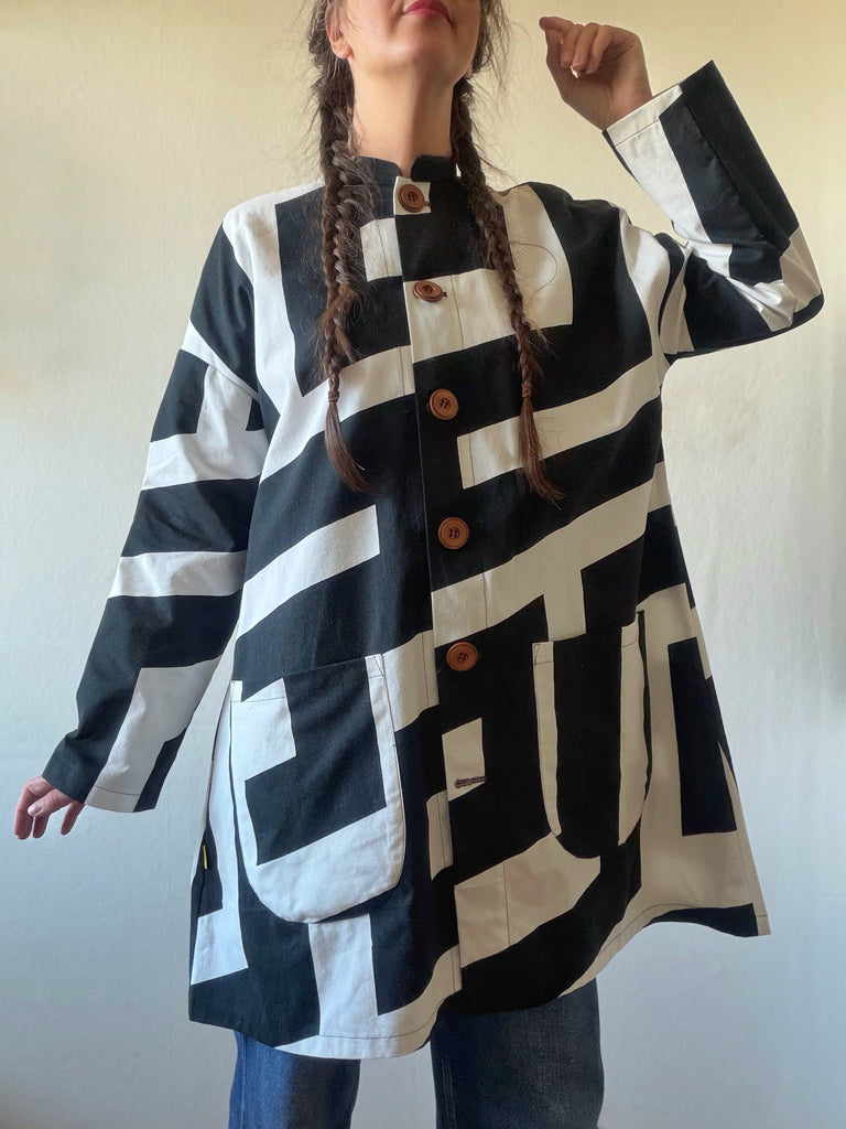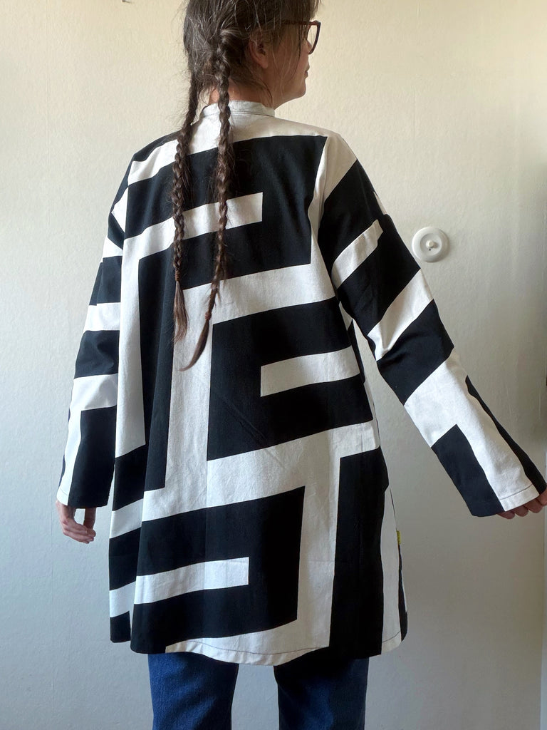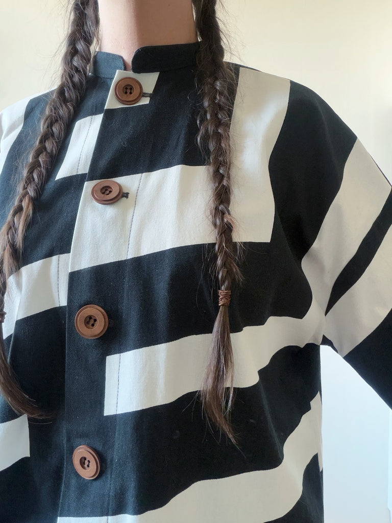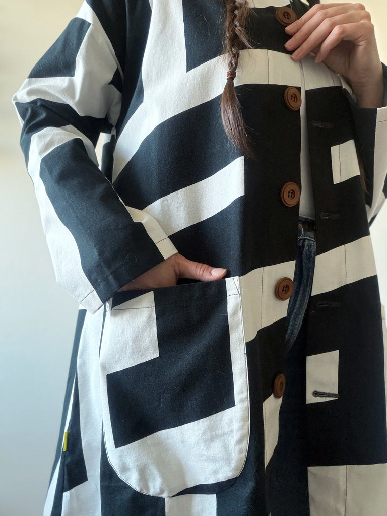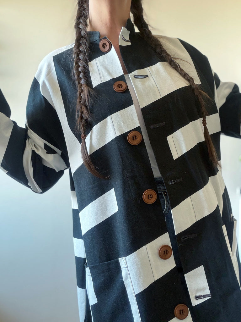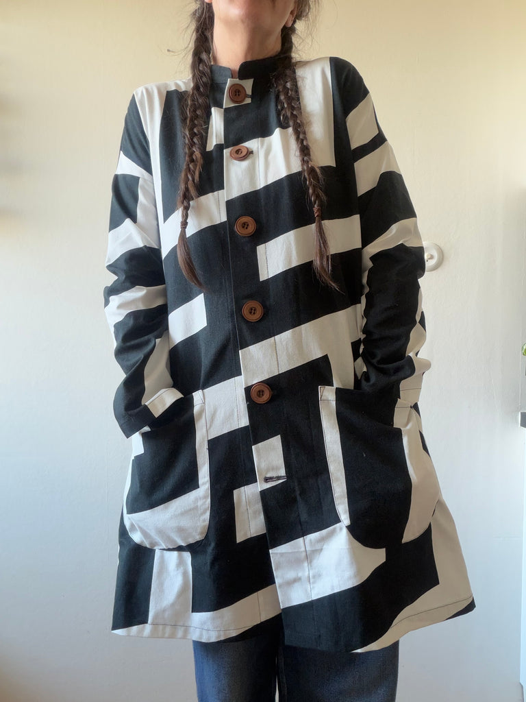 Svart och vitt grafiskt mönster som blev väldigt effektfullt på kappan. Tyget är återbrukad bomull som är lite stadigare. Fickor i samma tyg och stora fina träknappar.