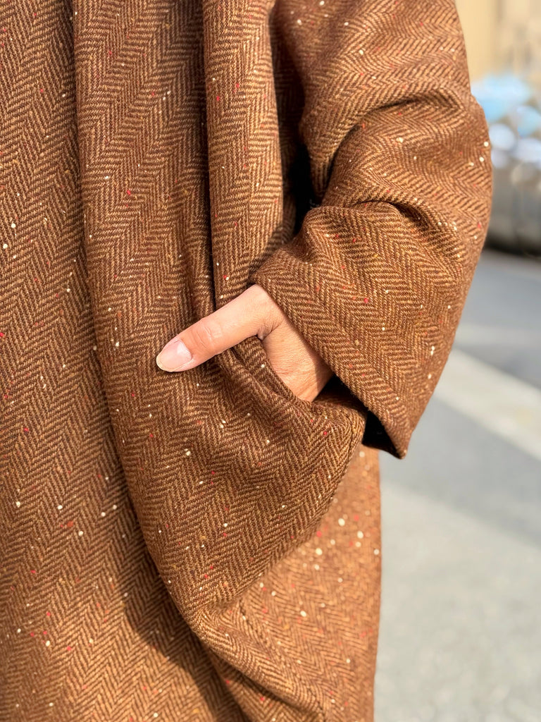 Snyggt och klassiskt fiskbensmönster i olika bruna nyanser. En tunn och följsam ull som inte sticks och passar även att ha som en kofta inomhus.