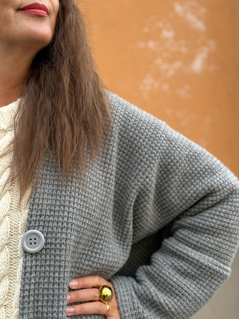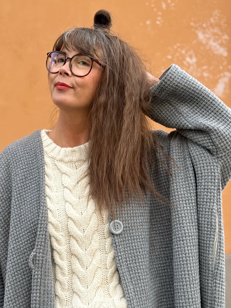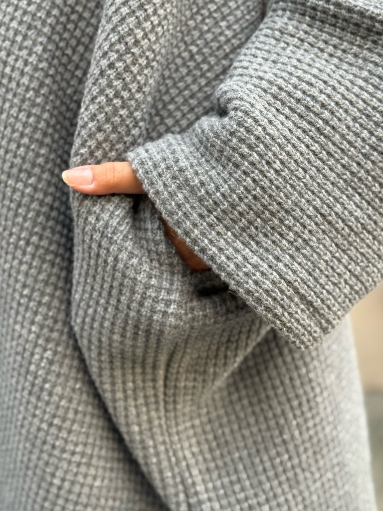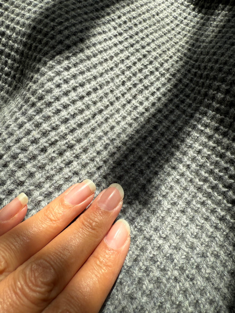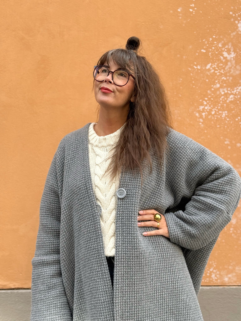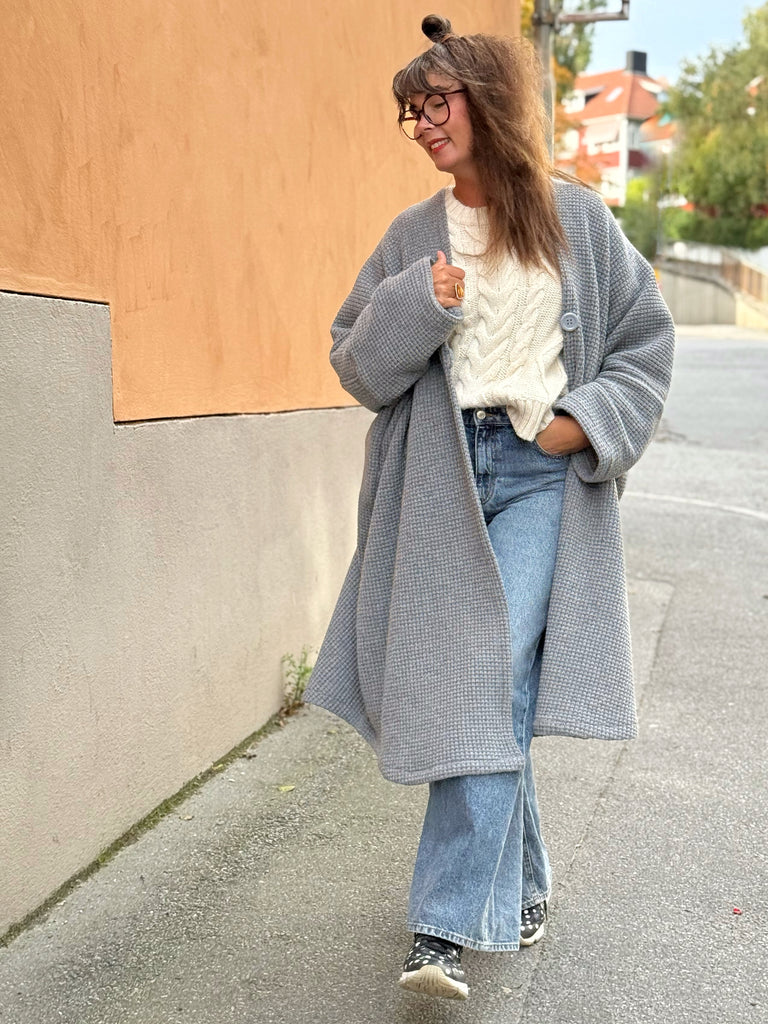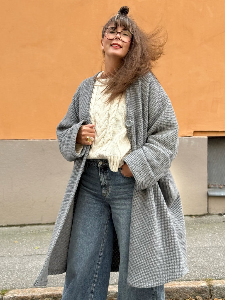 Underbart grå stickad ull. Vet inte vad just denna stickning heter men den har en vacker yta och är tät mellan maskorna. Perfekt grå nyans och jag tycker den är så pass kraftig att den lämpar sig bäst som kappa utomhus men är såklart en smaksak om man vill ha den som ett lyxigt gos-sjok istället. Tyget är deadstock.