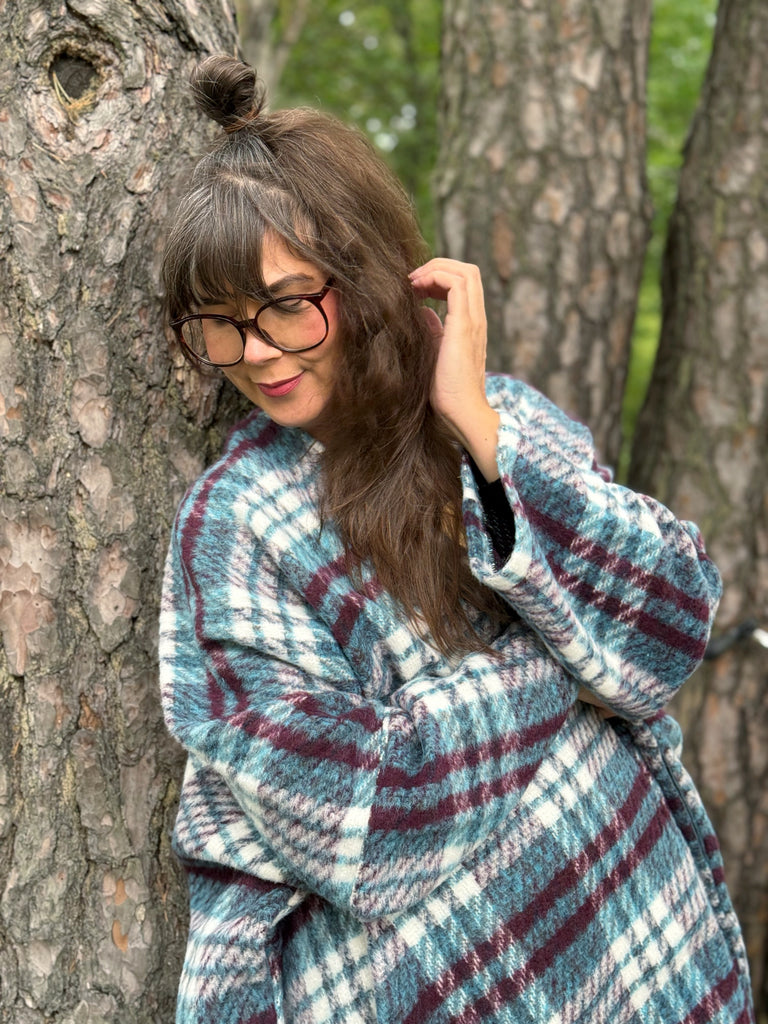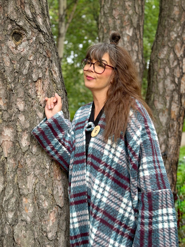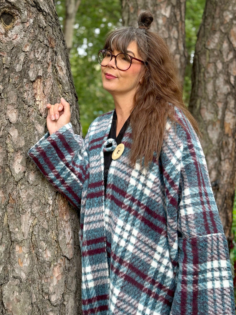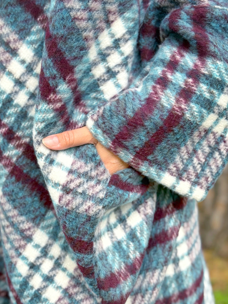 Kappan är i en ljuvlig färgkombination med petrol och violett i rutorna. Din höst och vinter kommer absolut bli festligare i denna kappa. Lite lätt luden yta och en slät inisida.