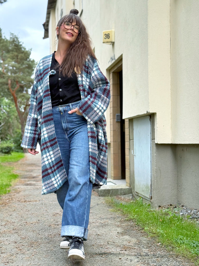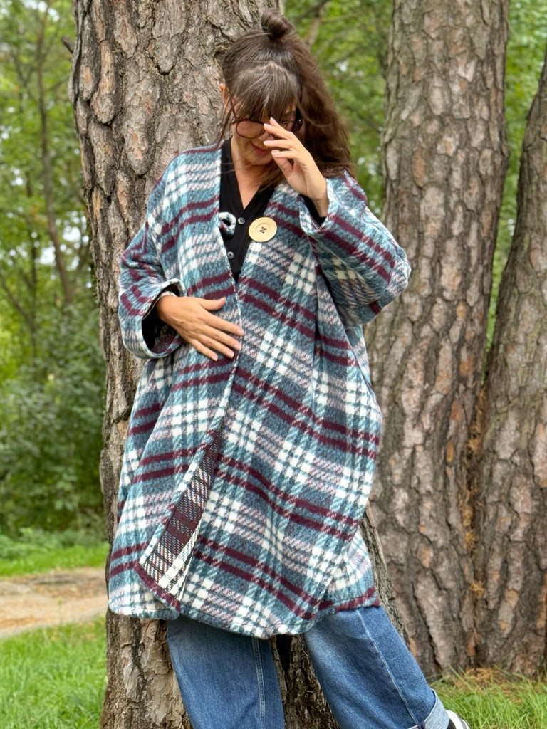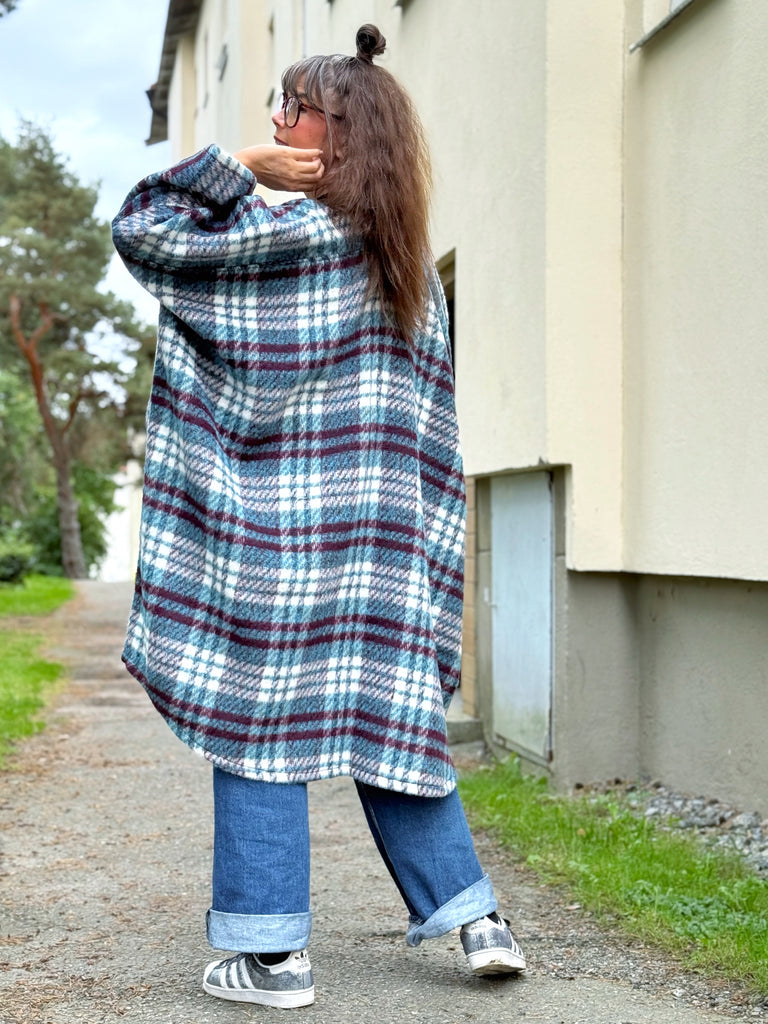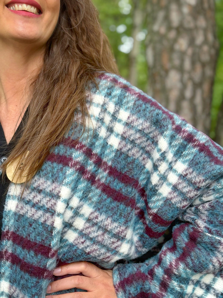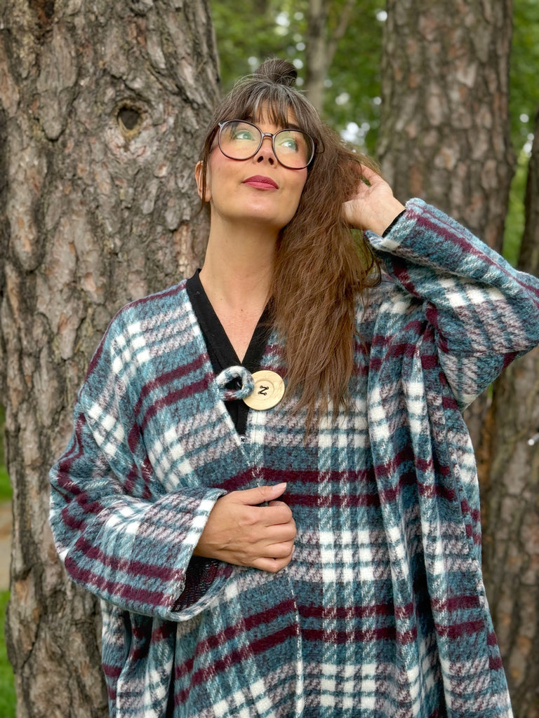Kappan är i en ljuvlig färgkombination med petrol och violett i rutorna. Din höst och vinter kommer absolut bli festligare i denna kappa. Lite lätt luden yta och en slät inisida.