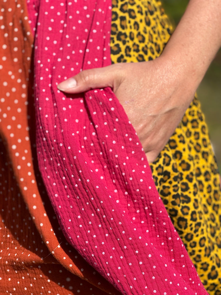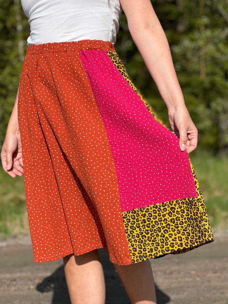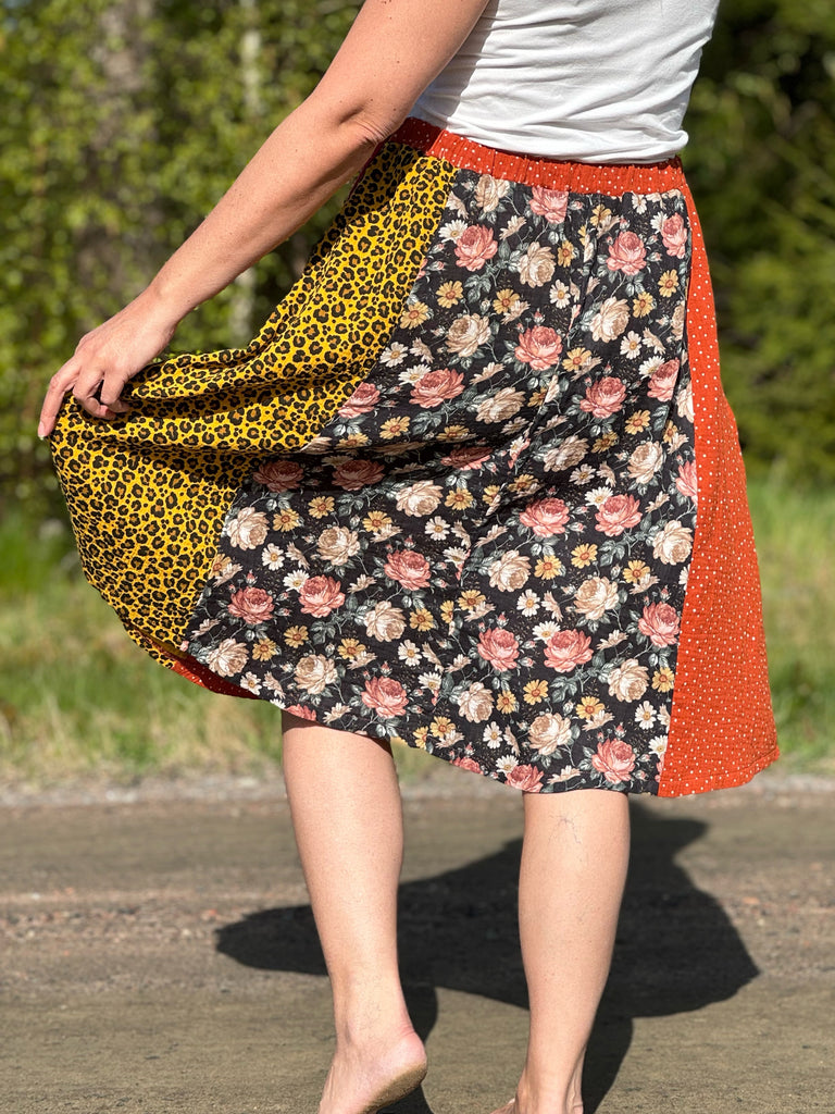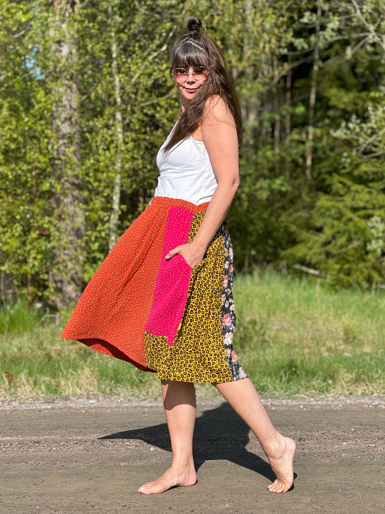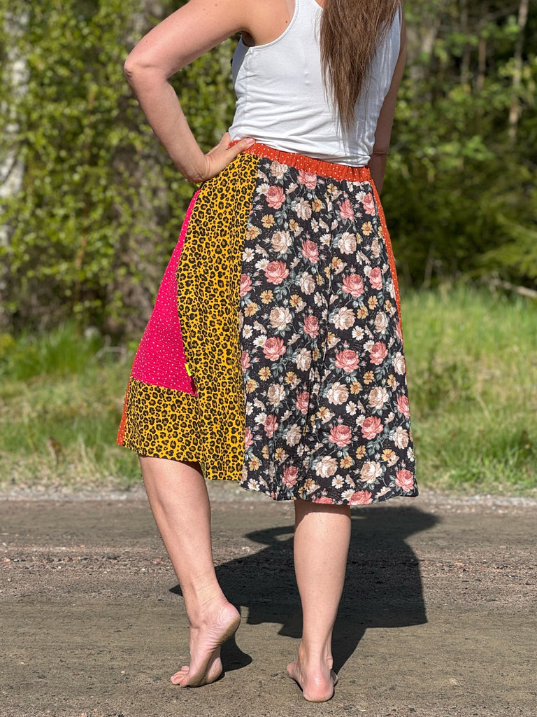 Helt tillverkad av mindre tygrester som var för små för att kunna bli plagg. Men nu har de tillsammans blivit en vacker och bekväm kjol. Lös och ledig i sin passform med resår i midjan och självklart fickor i sidorna. Bra för miljön och unik för dig, så bra!