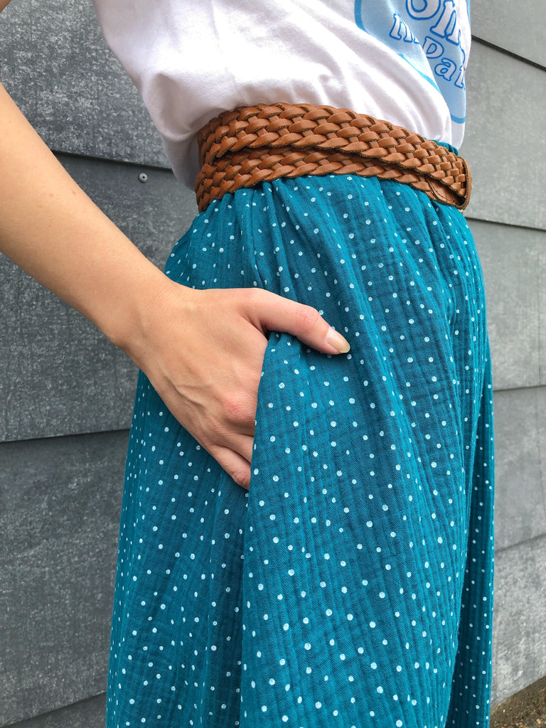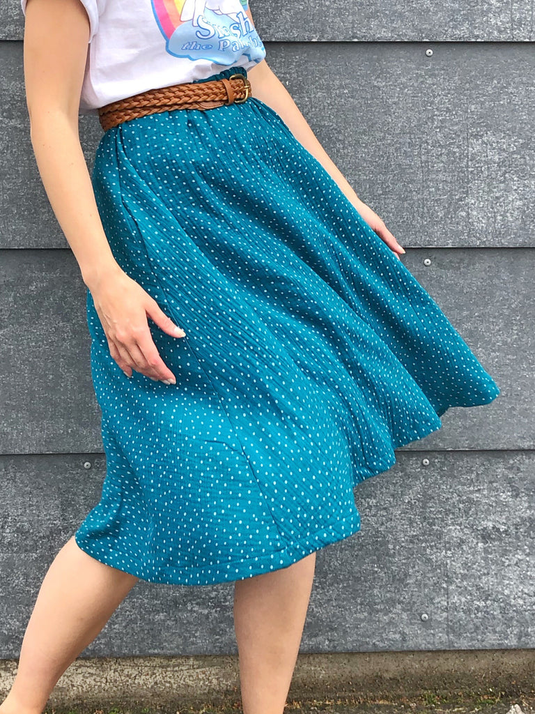 Denna användbara och bekväma kjol som du kommer att älska är i den perfekta turkosblå, petrol, nyansen. Samt med små vita ojämna prickar. Så fin!