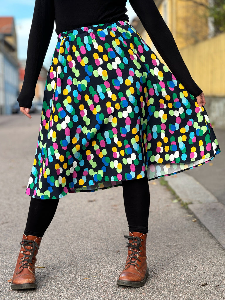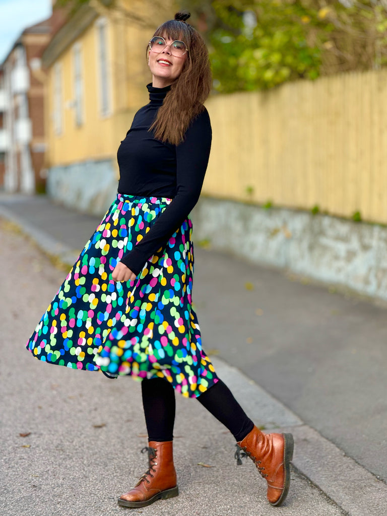 En kjol som passar vid alla tillfällen och är luftig och sval. Jag gillar att sätta ett skärp i midjan när den följer med mig på festligheter. En väldigt lättburen kjol som går att variera väldans mycket.