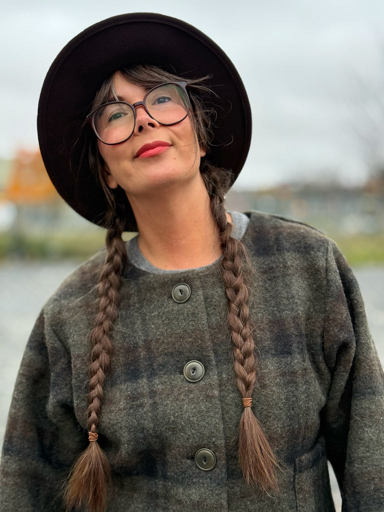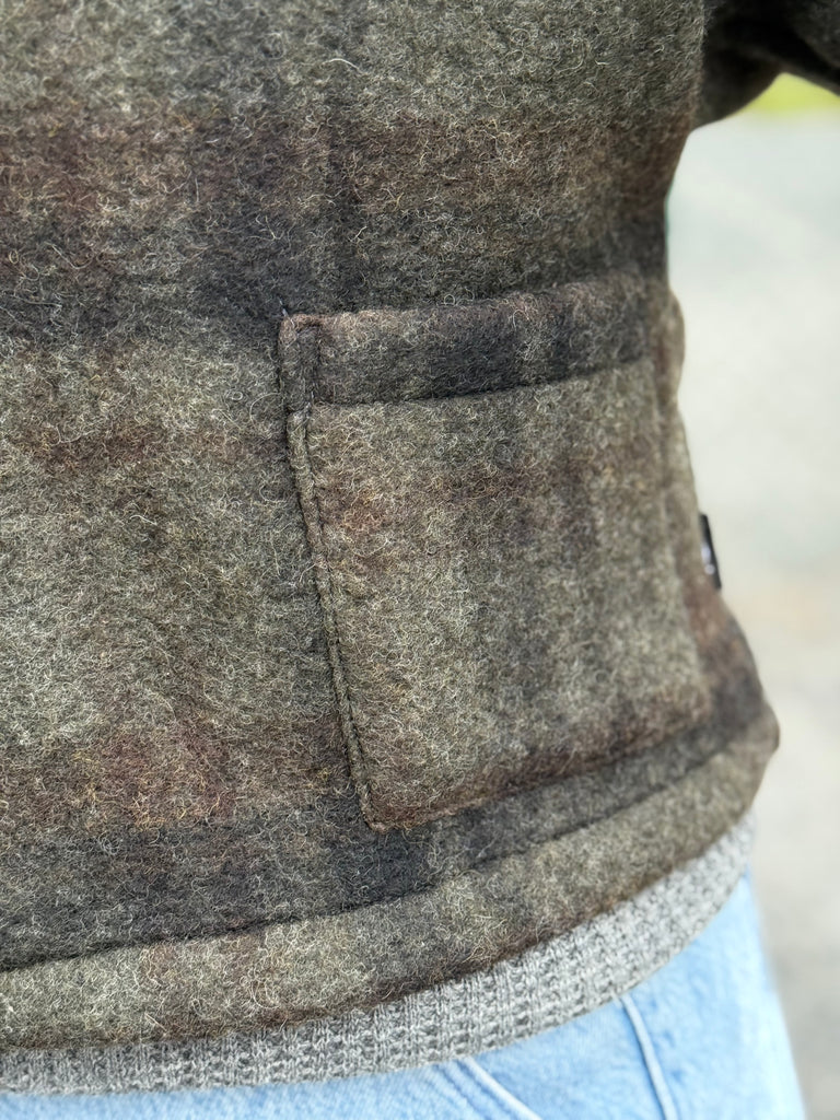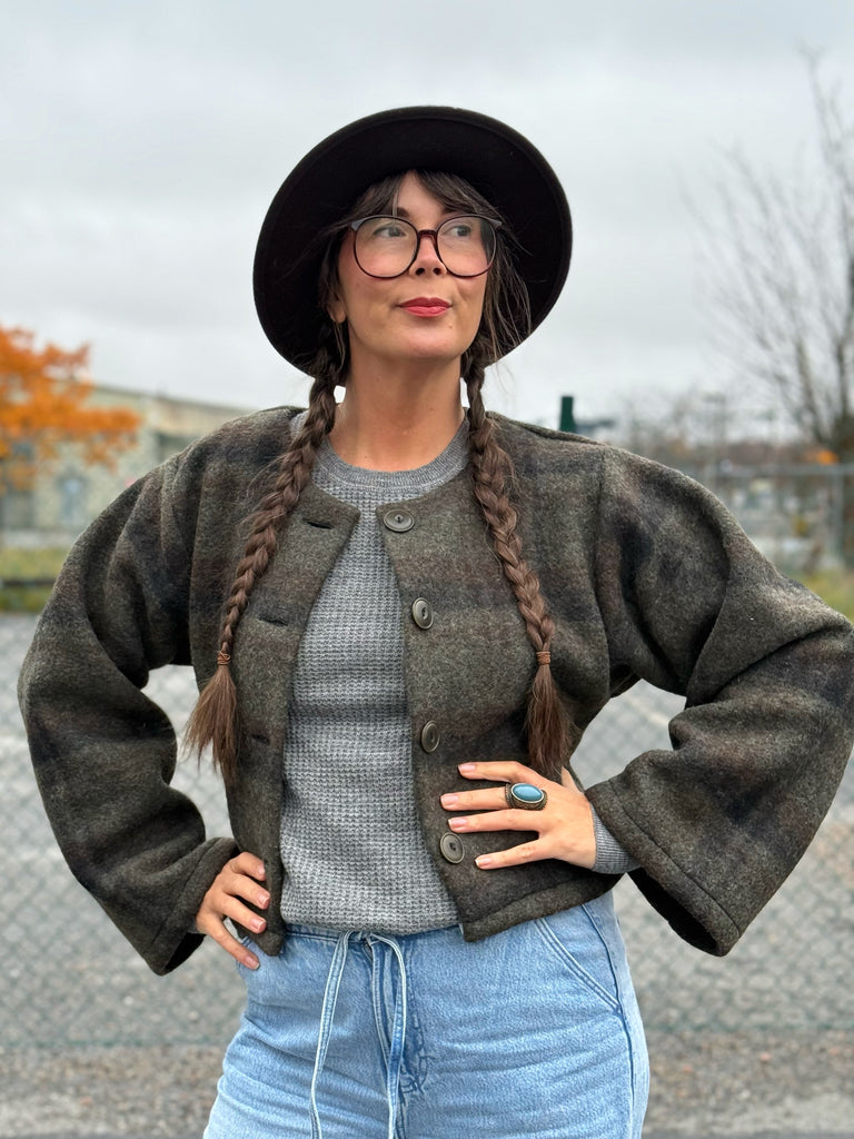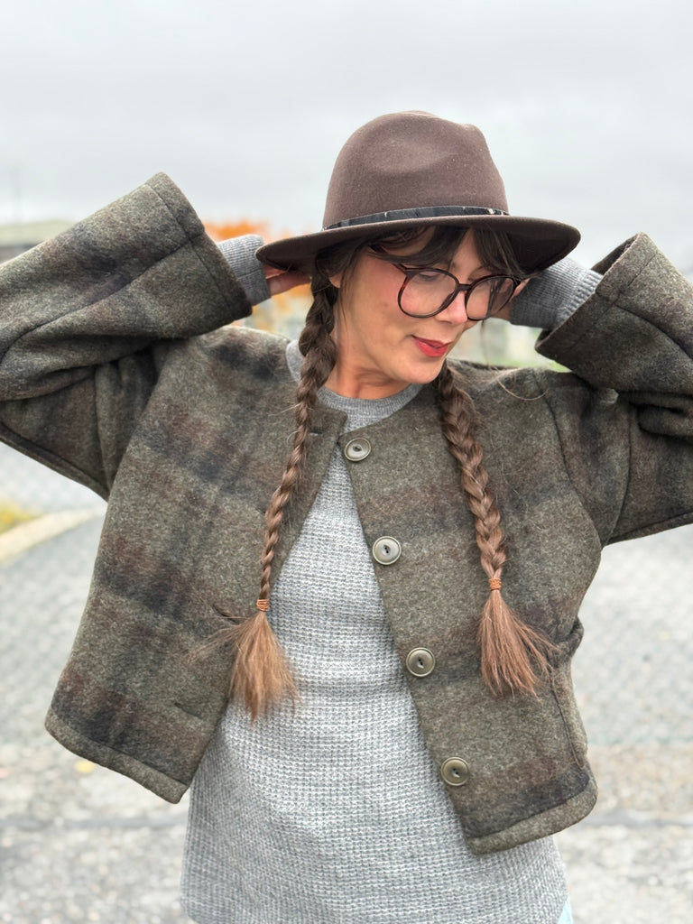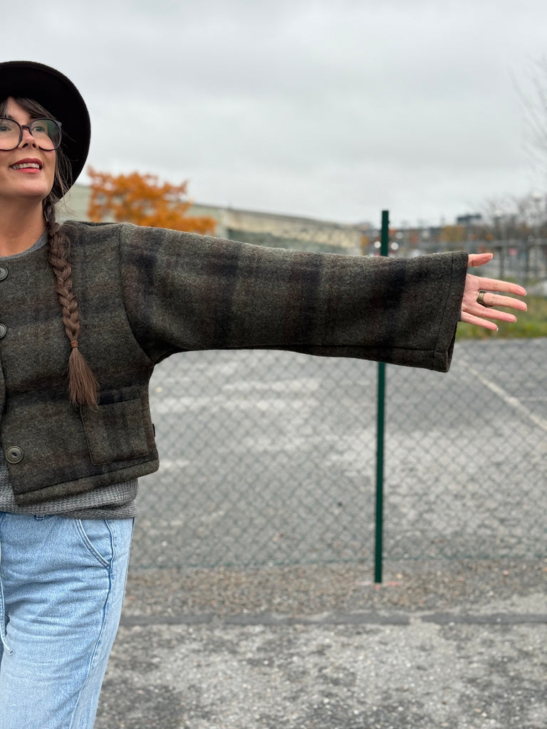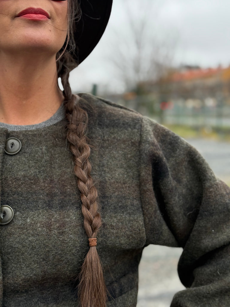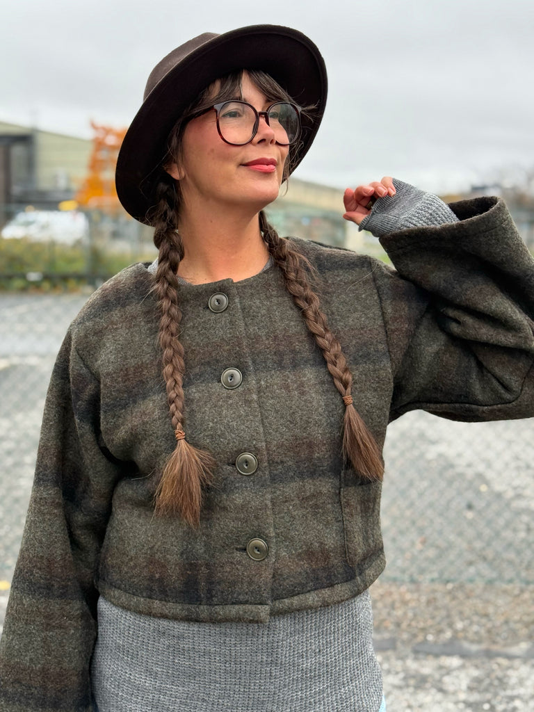 Denna jacka är i en behaglig ullmix som är relativt följsam. Rutig i murrigt grönt och brunt. Tyget är deadstock. Syr dessa jackor av tyger som blir över från mina kappor.