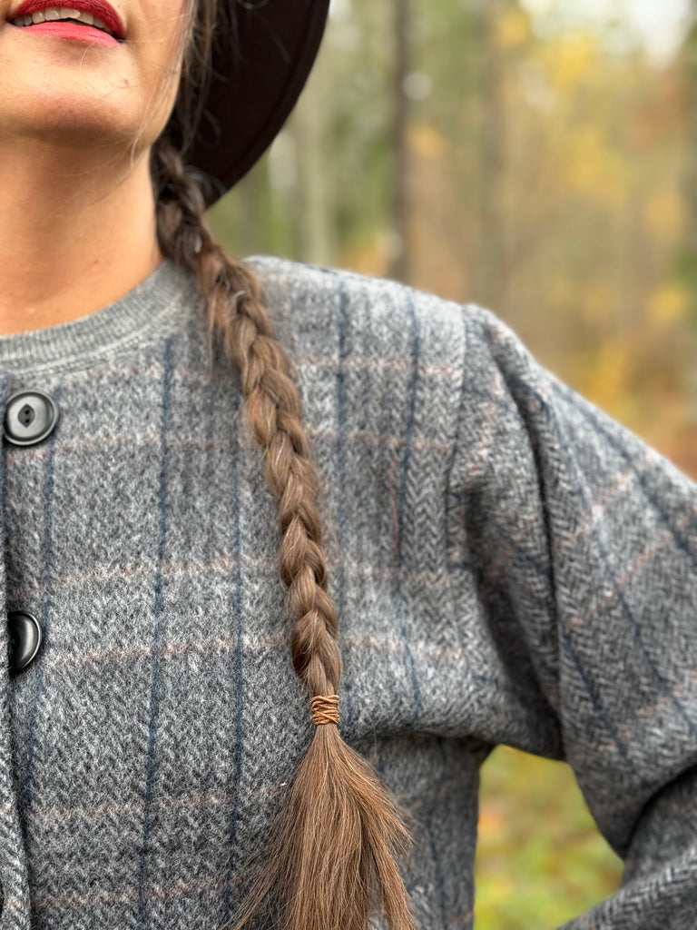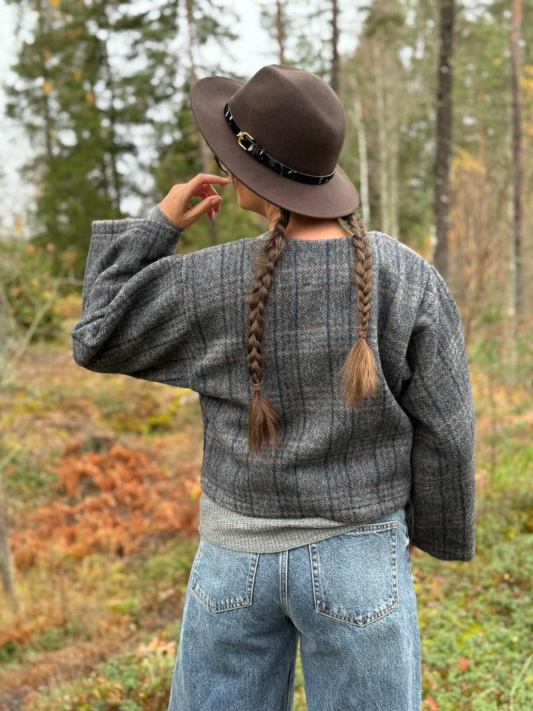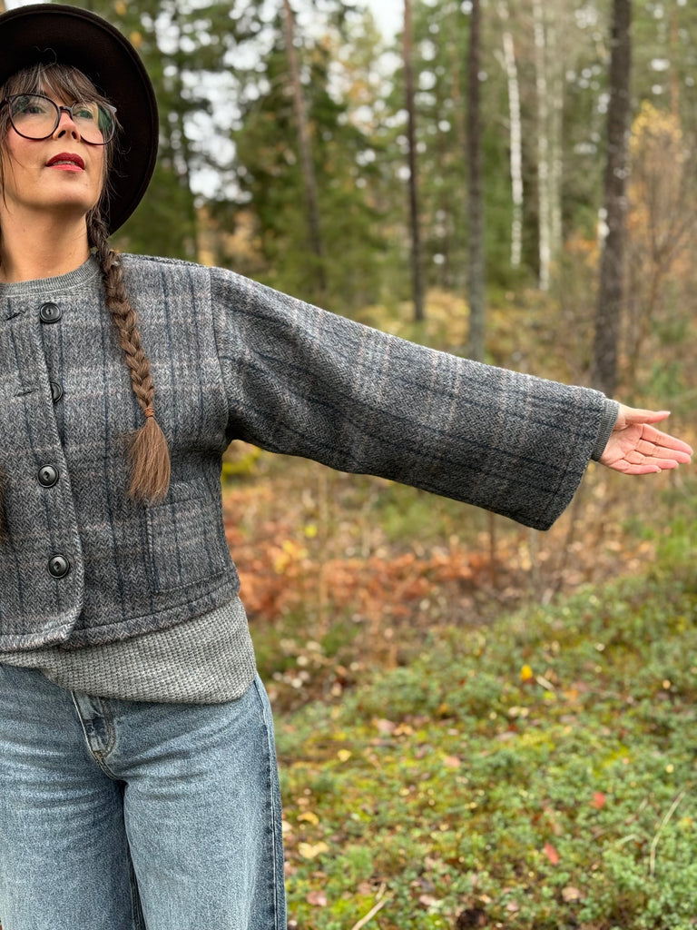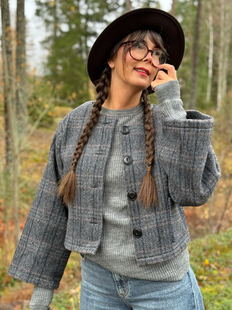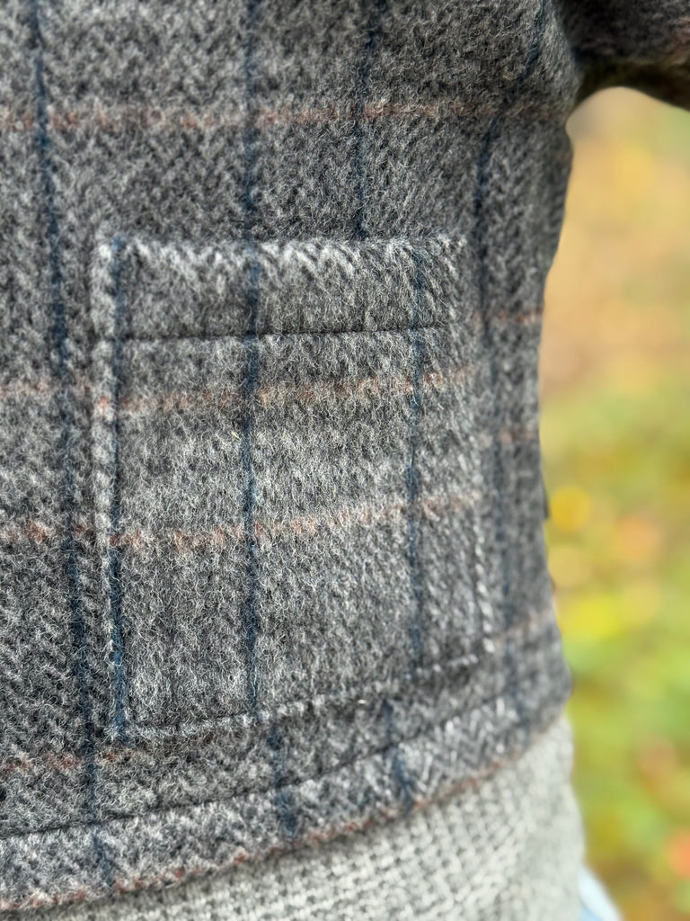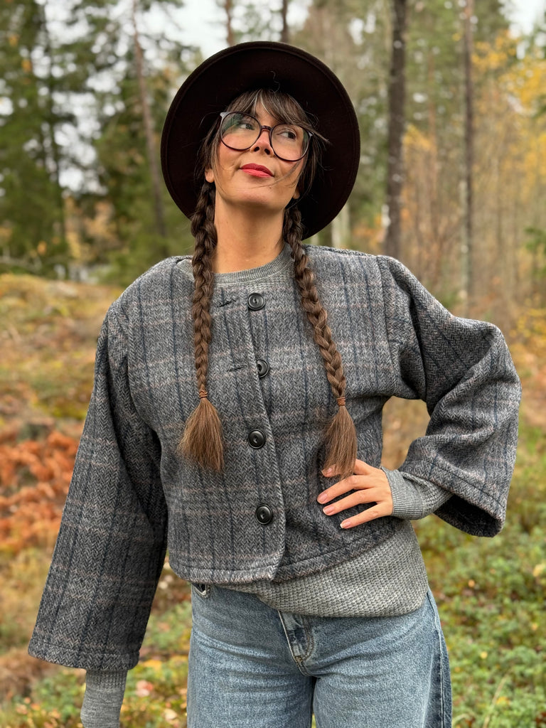Denna jacka är i en rutigt deadstock ull. Grått mönster med inslag av blått och tegel. Medeltjock tät kvalitet. Syr dessa jackor av tyger som blir över från mina kappor.