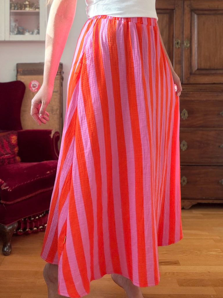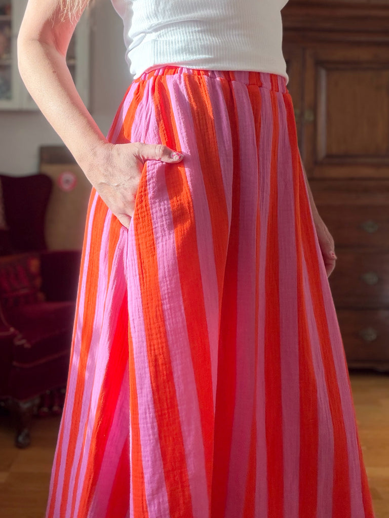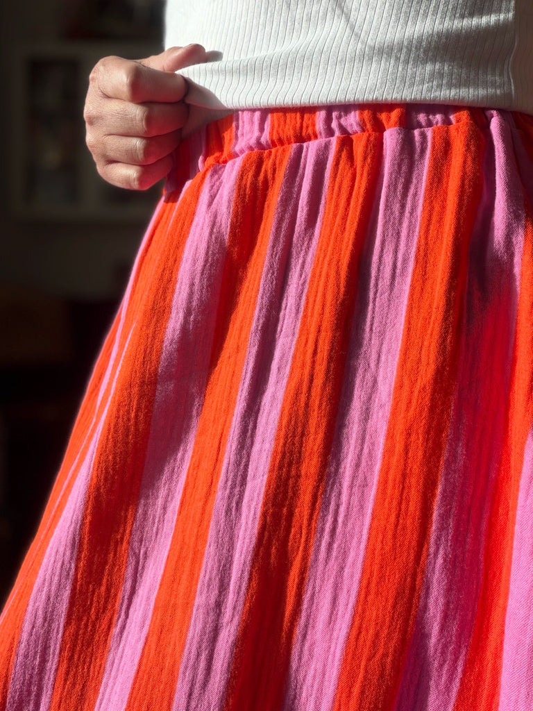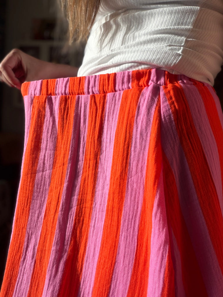 Randig i rosa och orange – färgstark men ändå lättburen. Mjuk muslin med en naturlig skrynklig yta.