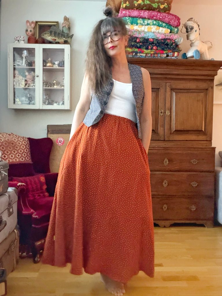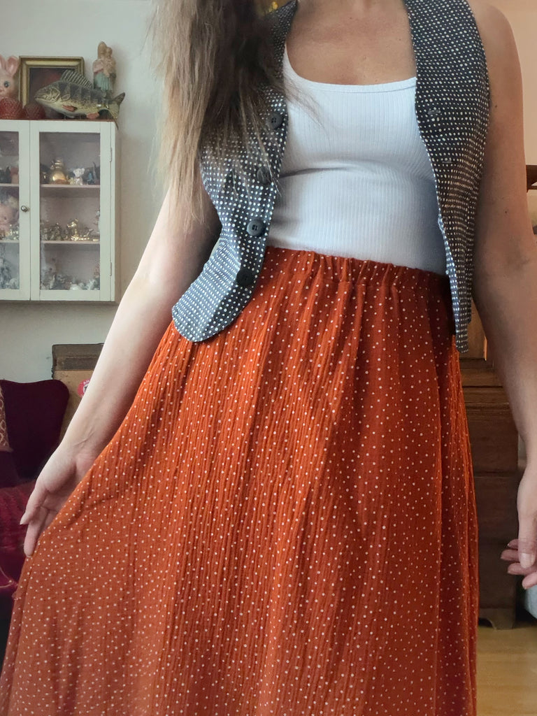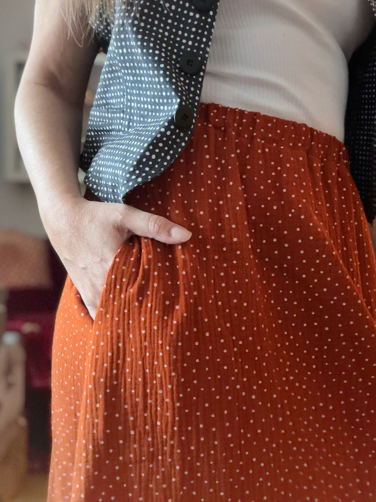 Mitt absoluta favorittyg. Tegel, rost eller teracotta. Kärt barn har många namn. Perfekt med små vita prickar osymmetriskt utspritt över hela. Mjuk muslin med en naturlig skrynklig yta.