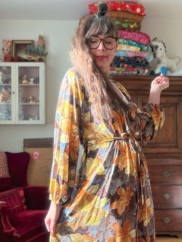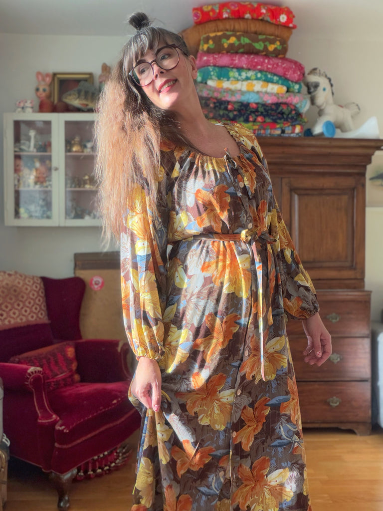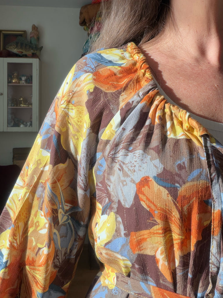 Denna långklänning är i ett vackert viskostyg med en sträv känsla på ytan. Lite retrokänsla med mönster gult, orange och brunt. Dessutom med guldtrådar i väven.