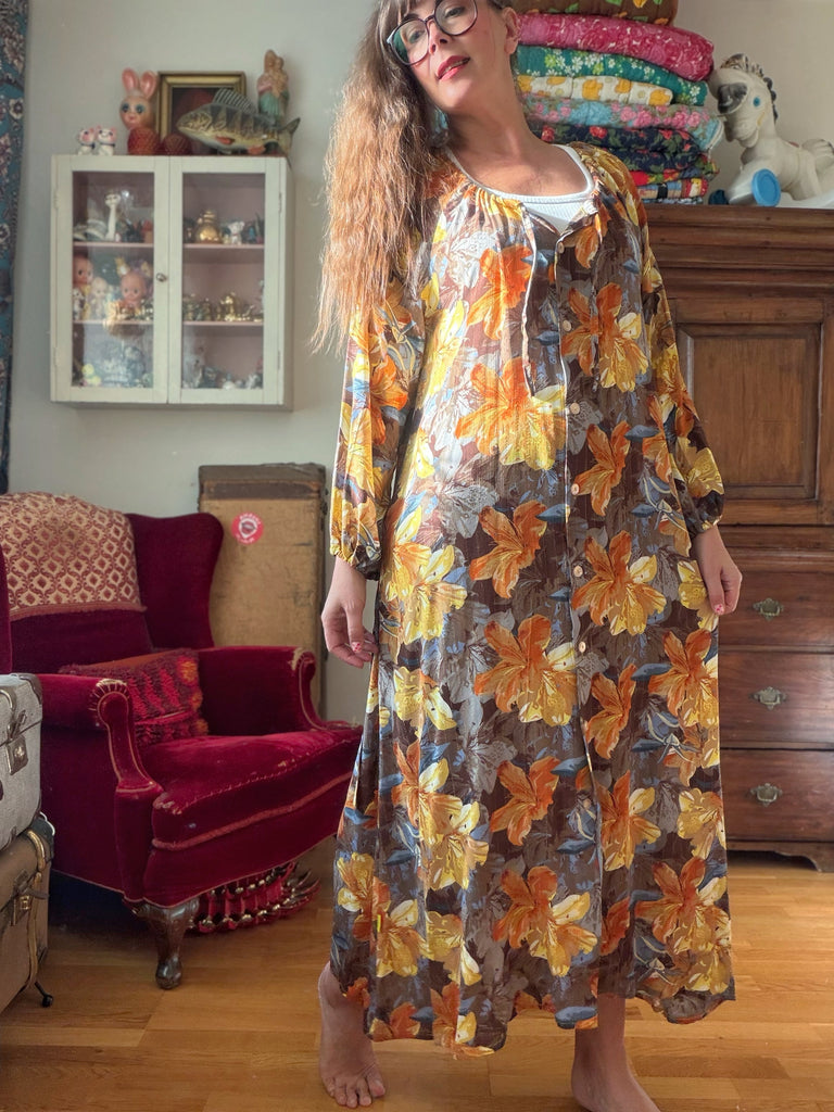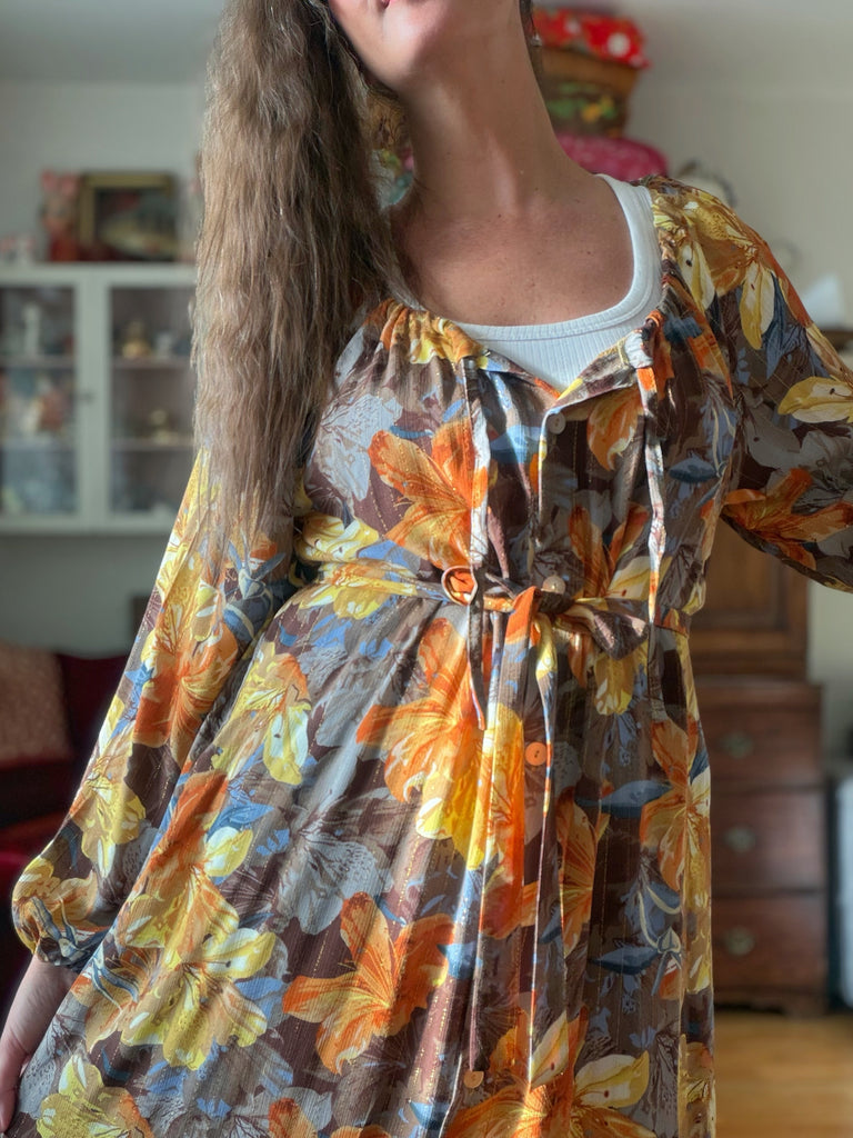 Lång vid klänning med knappar fram, vida ärmar med resårslut och band i halslinningen samt fickor och ett tillhörande skärp.