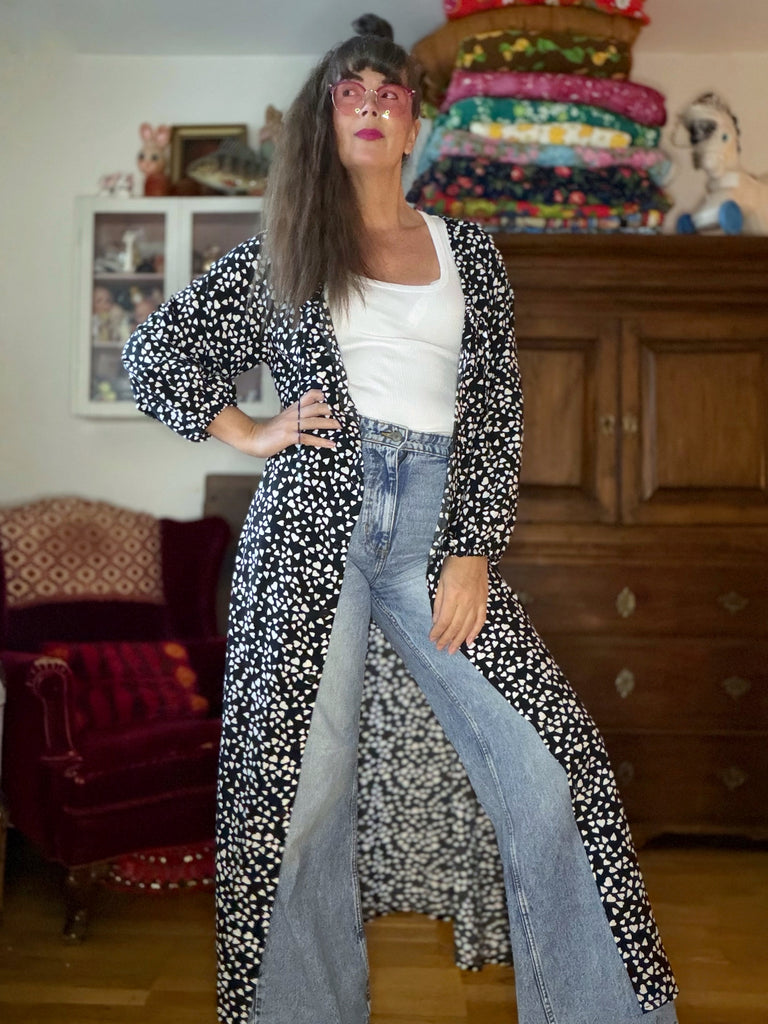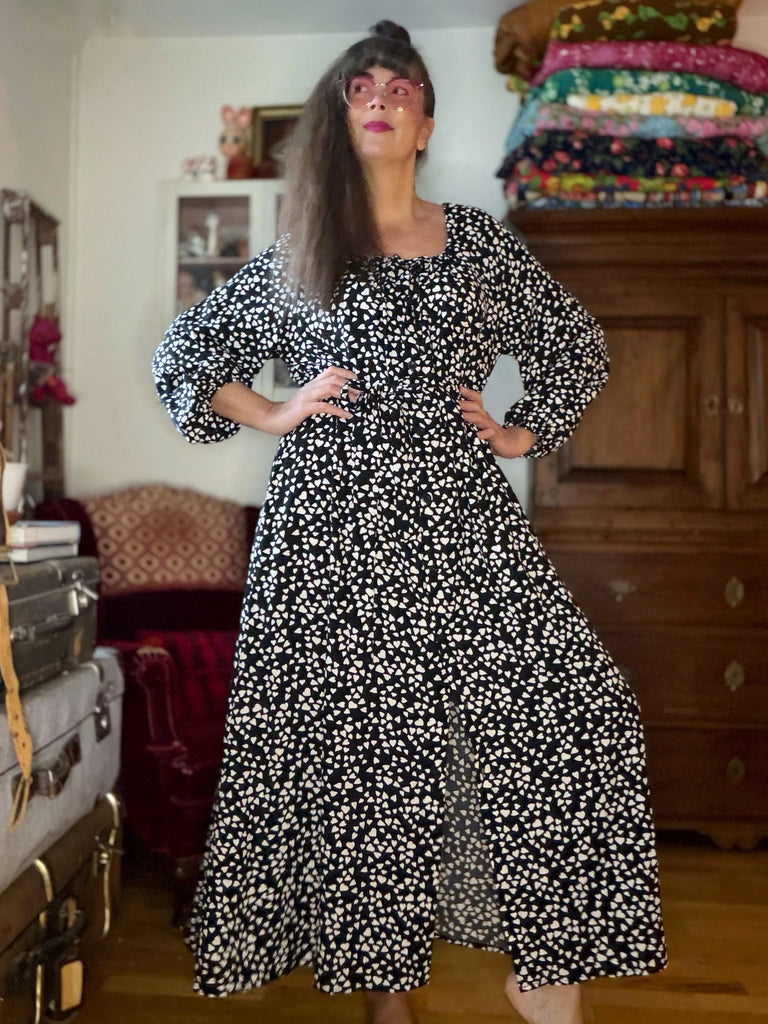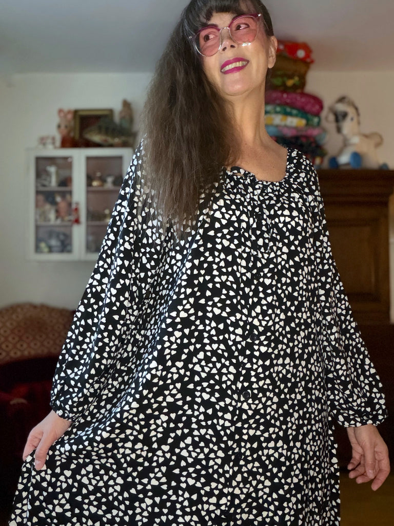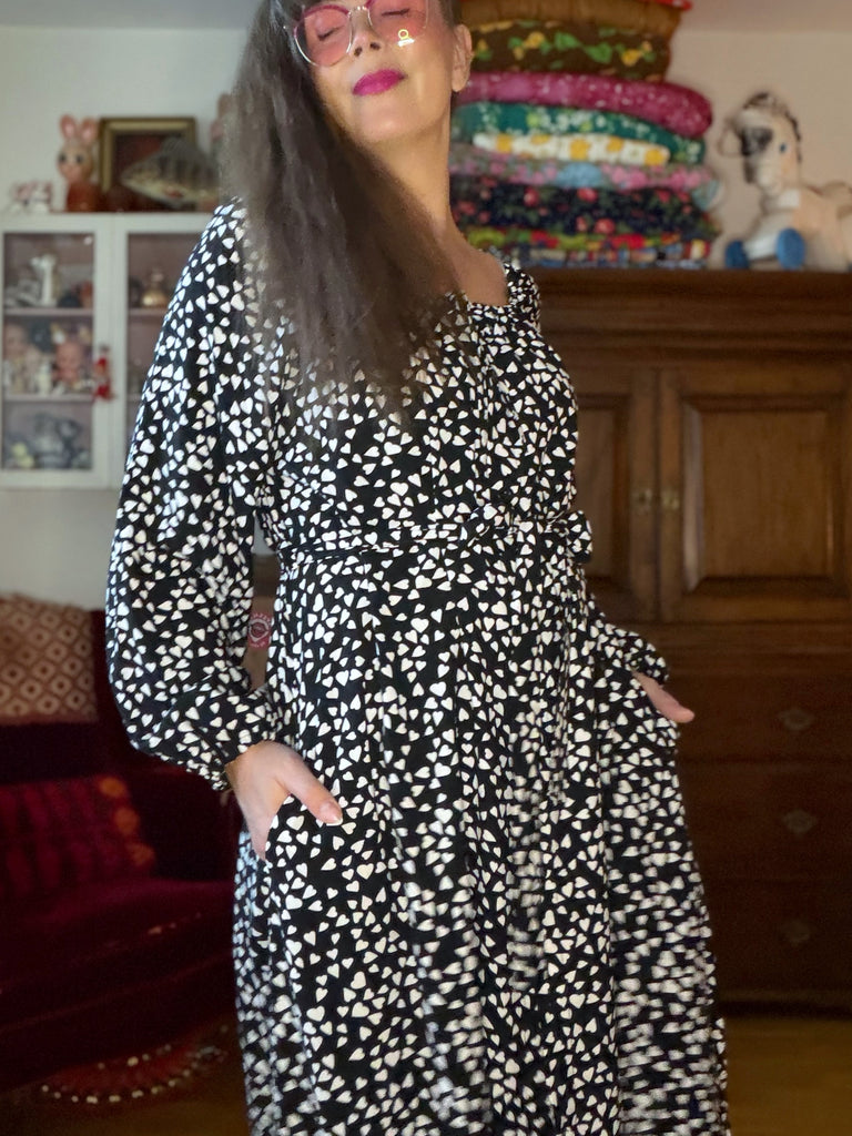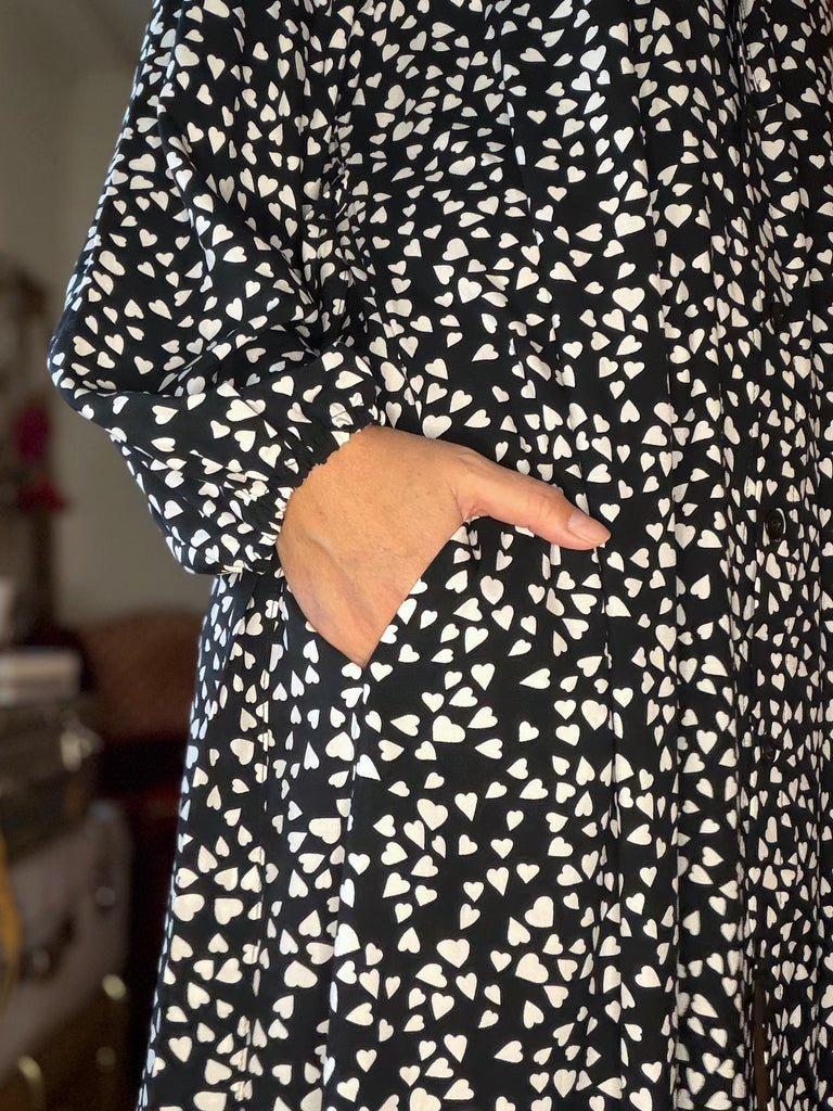 Denna långklänning är i ett vackert följsamt viskostyg. Svart bottenfärg med små vita hjärtan huller om buller. Slät yta med en sval känsla.