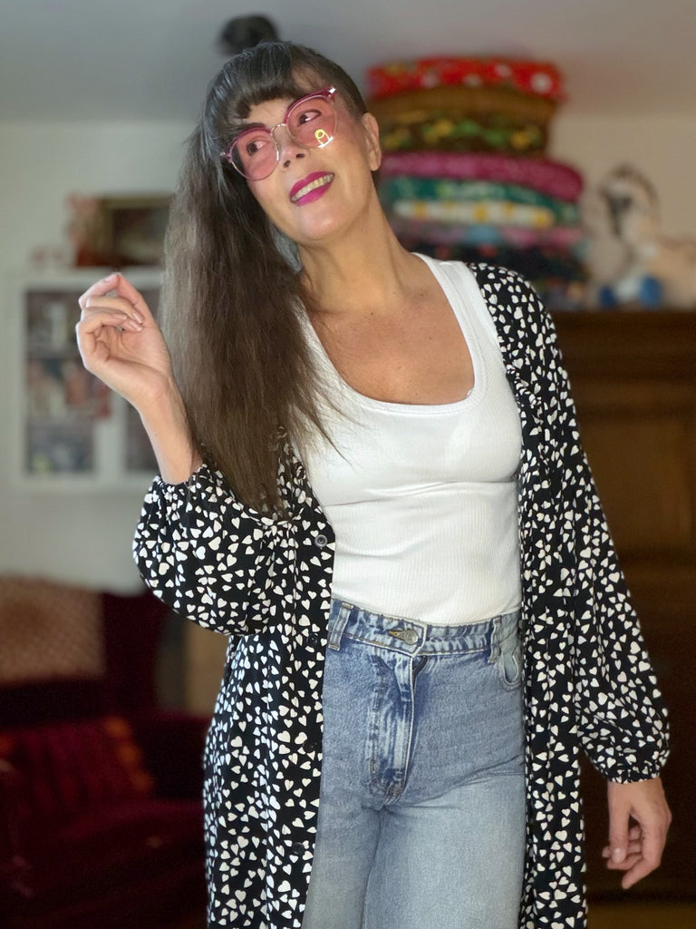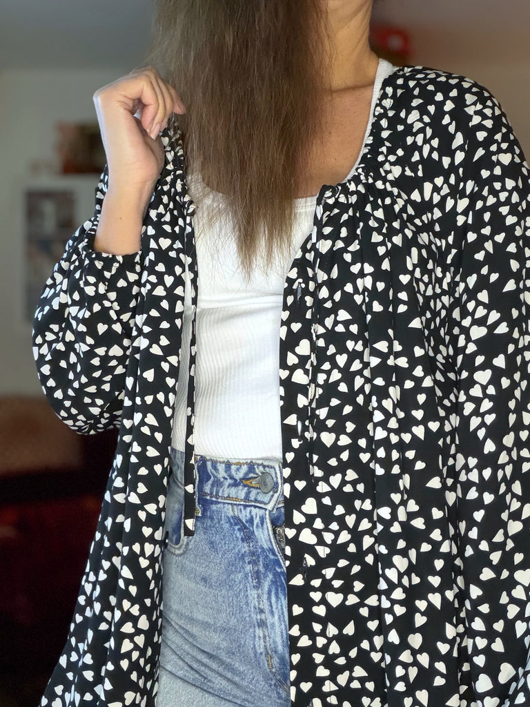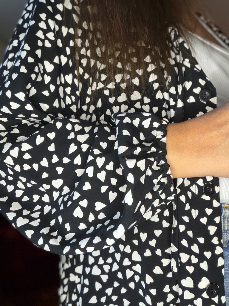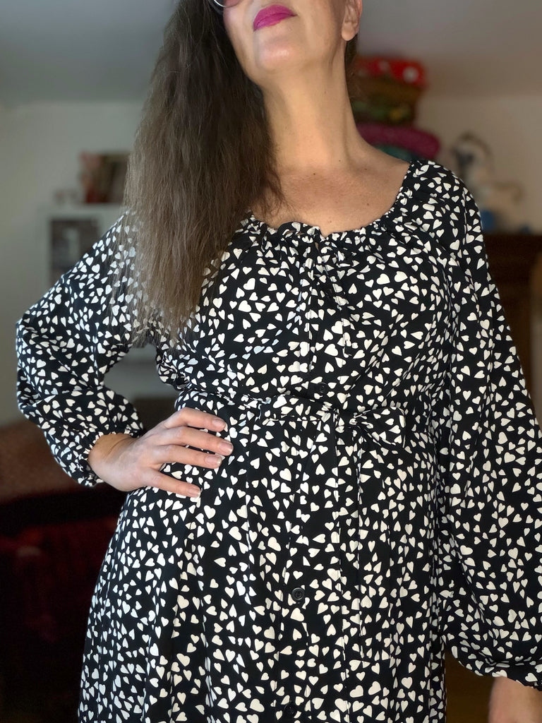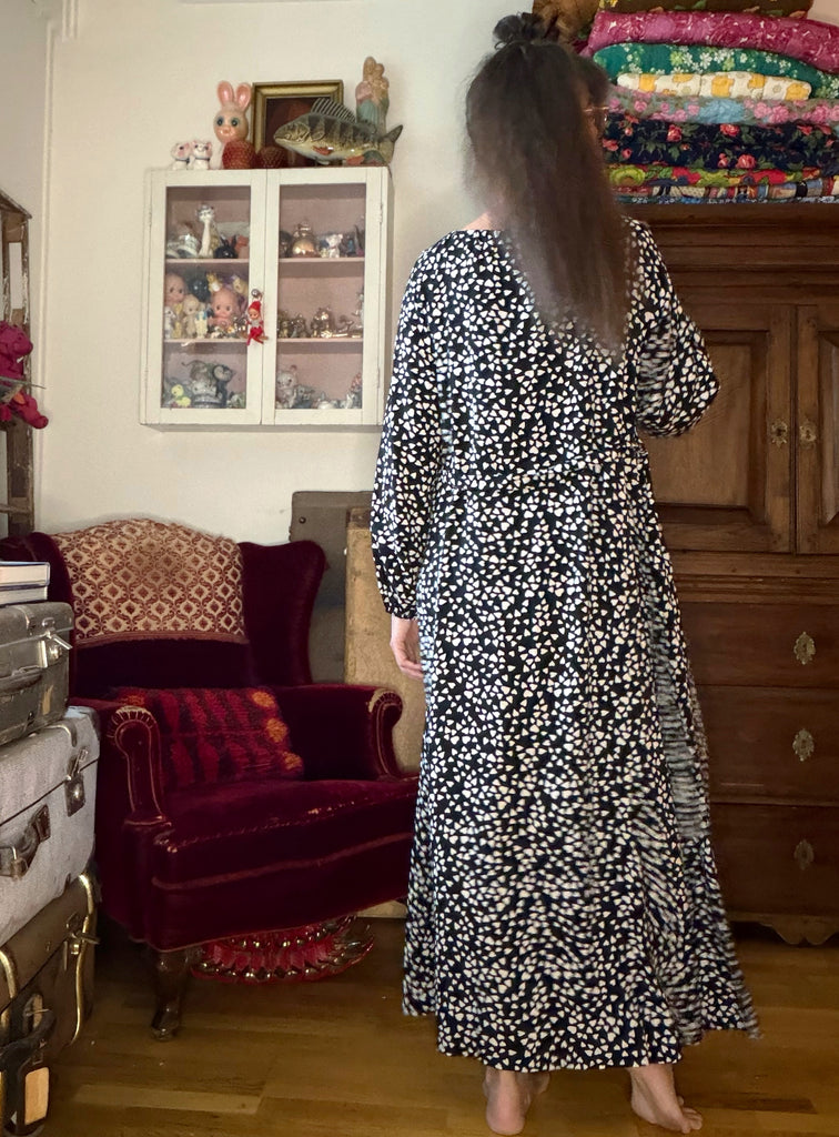 Denna långklänning är i ett vackert följsamt viskostyg. Svart bottenfärg med små vita hjärtan huller om buller. Slät yta med en sval känsla.