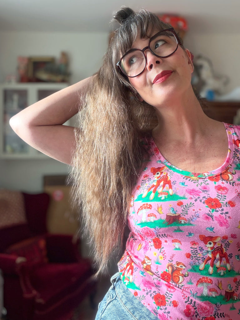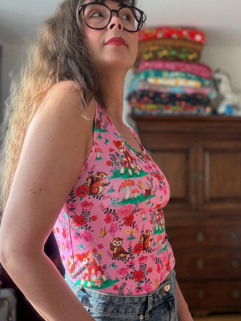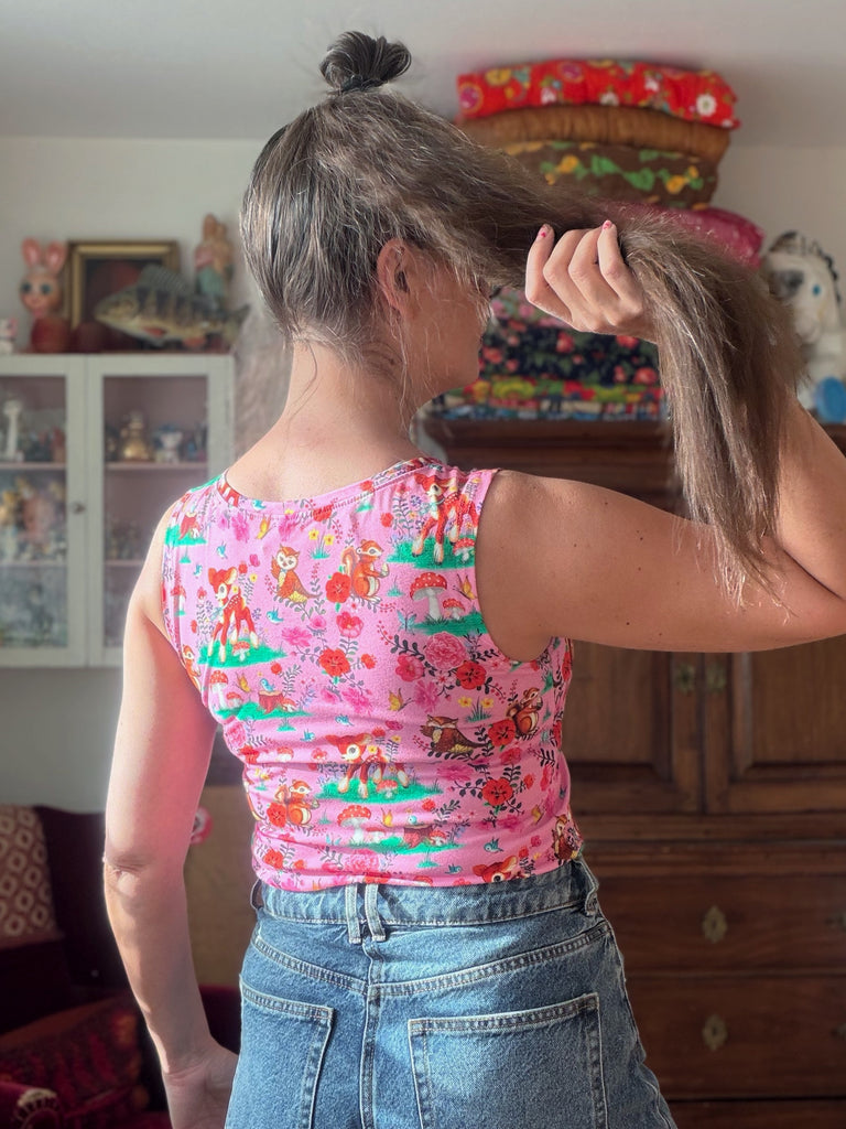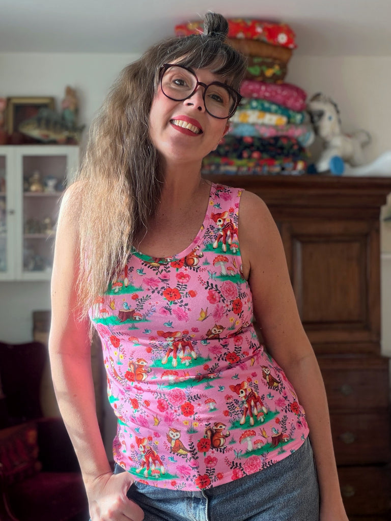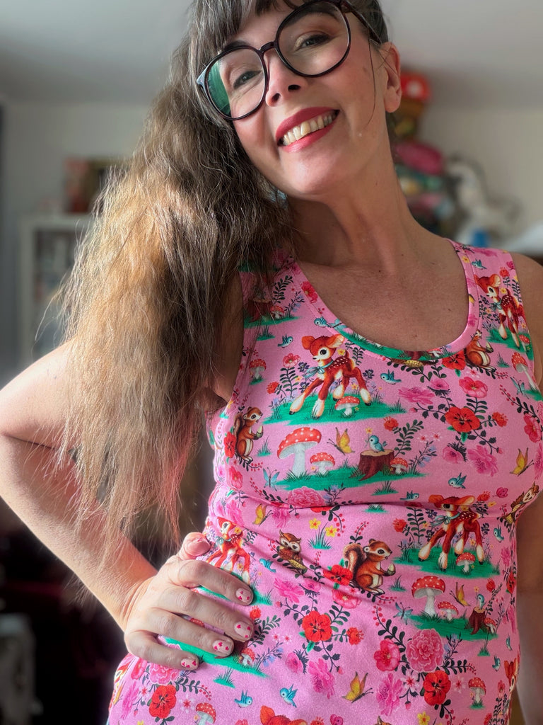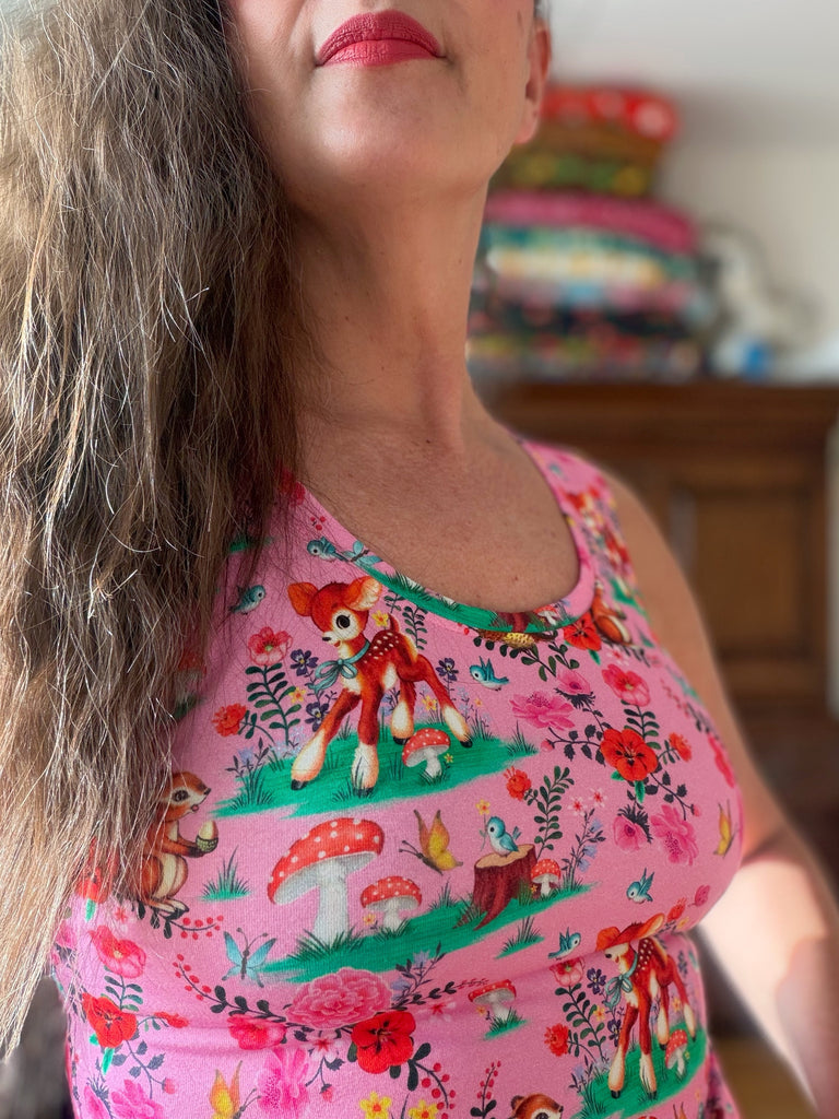 Kul mönster med djur och växter i härliga färger på en rosa botten. Tyget är ekologiskt och GOTS-märkt.