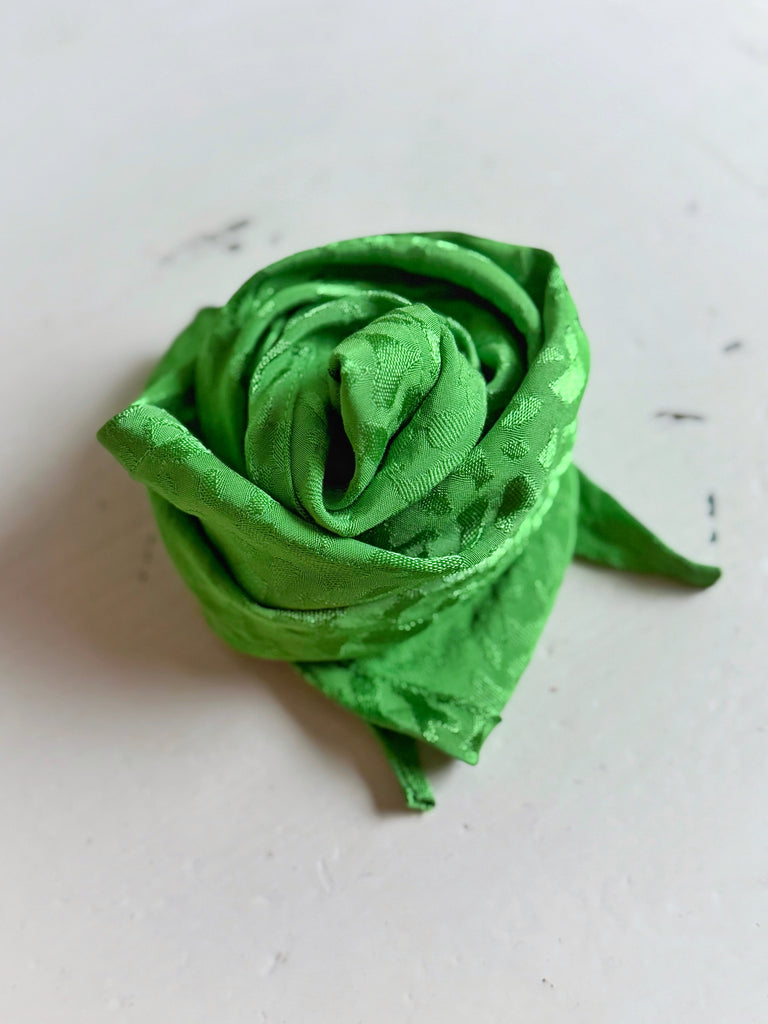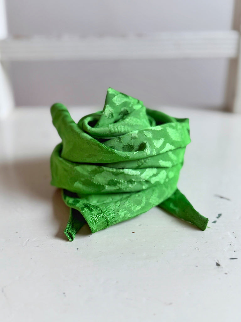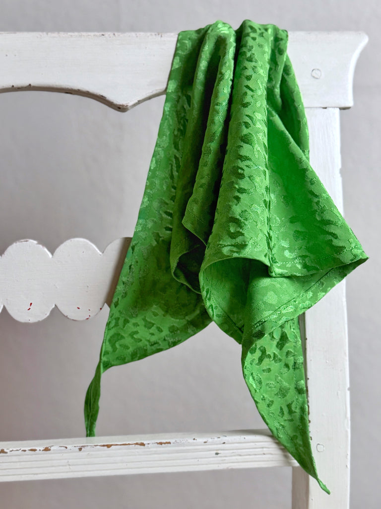 Dessa små sjalar sys av mina tygrester och kommer i många mönster och färger. Just denna är knalligt grön i ett jacquardvävt leopardmönster. Sjalen är 95 cm som längts.