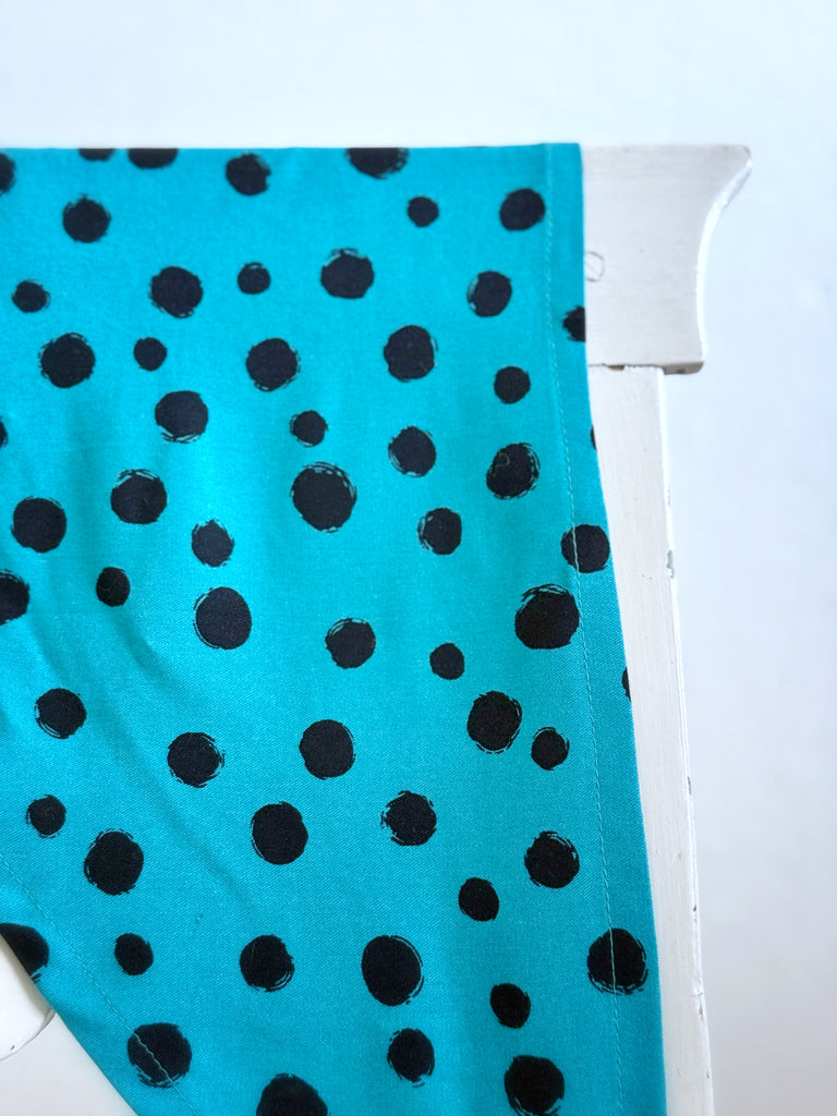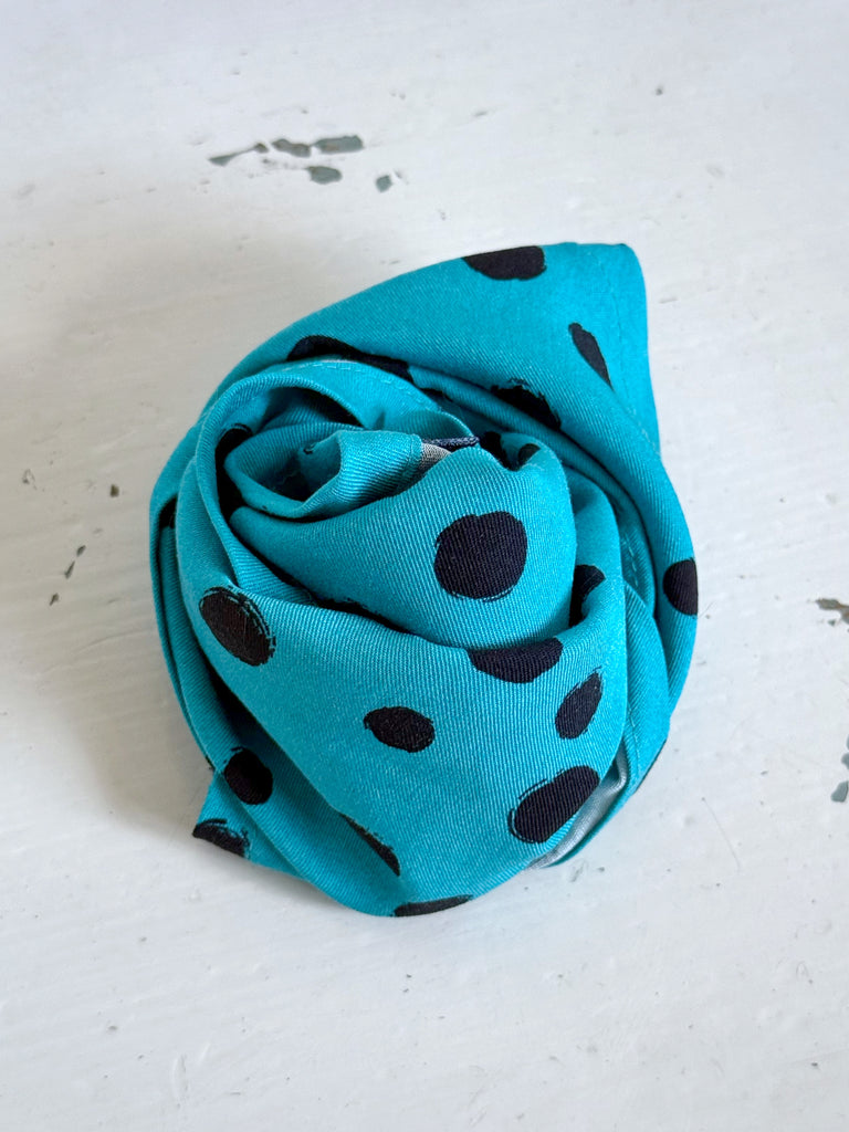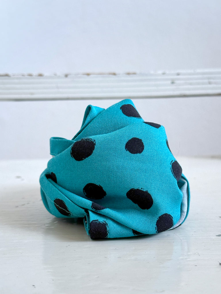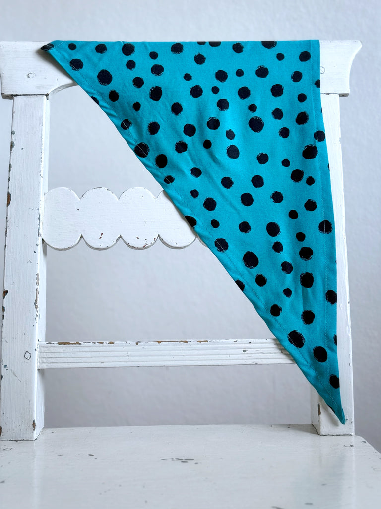 Dessa små sjalar sys av mina tygrester och kommer i många mönster och färger. Just denna är turkos med svarta prickar. Viskos.