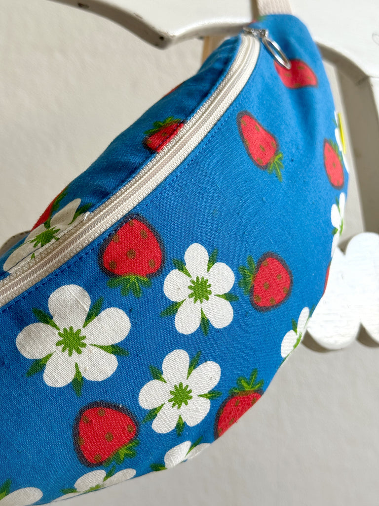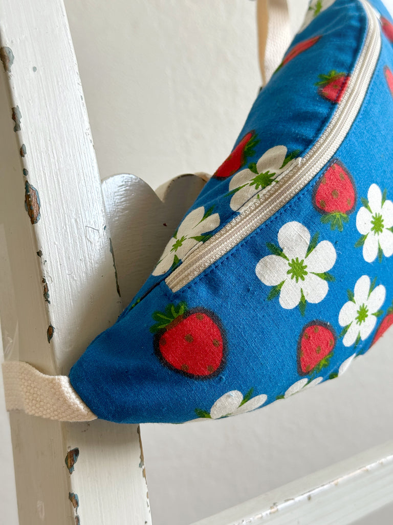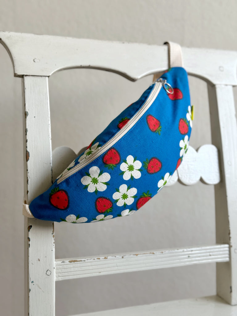 Just denna väska är sydd i ett oerhört charmigt tyg. Klarblått med jordgubbar på. Tygerna är i 100% bomull och den är helfodrad.