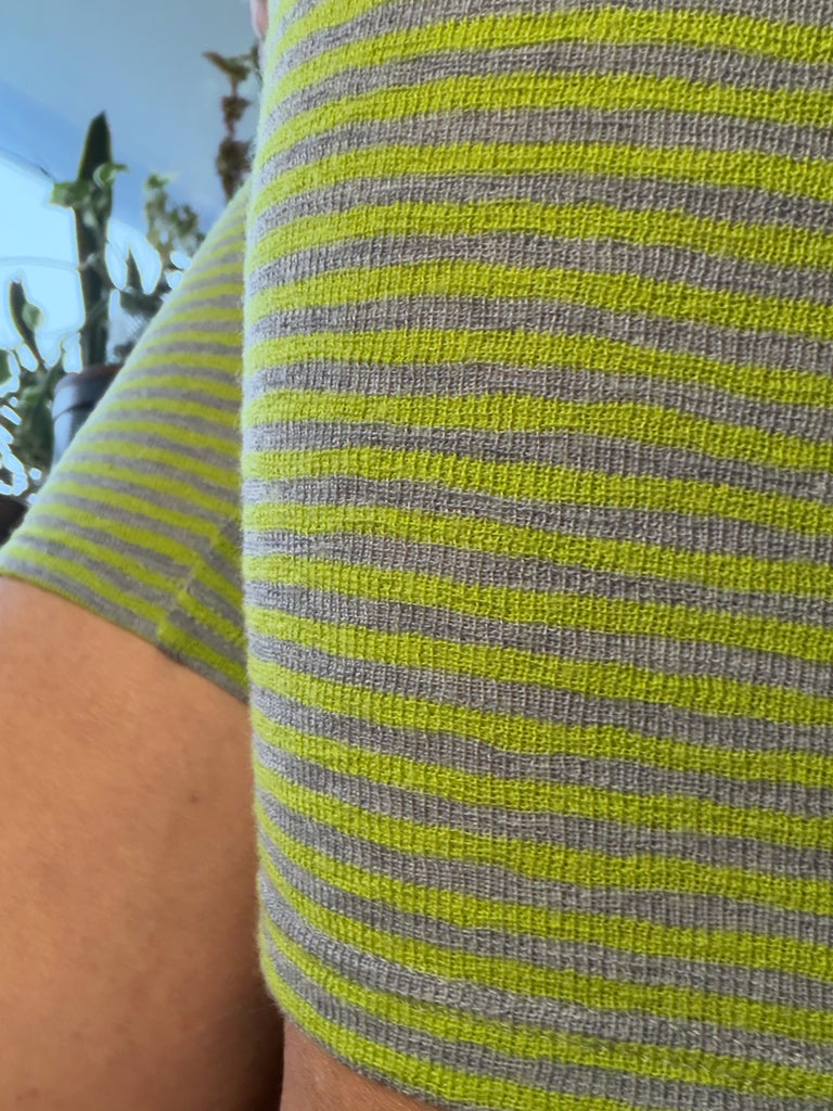 Randiga i grått och ljusgrönt. En liten färgklick i mjukaste ullen.