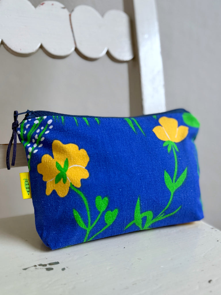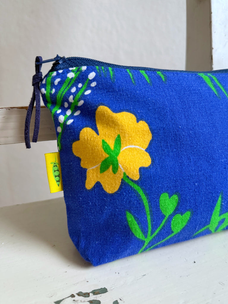 En liten necessär sydd av tygrester från min produktion som förtjänade ett eget liv. Varje necessär blir unik, med sin egen kombination av färg och mönster. Denna har en blå botten med blommor i gult och rött. Detta är ett vintagetyg. Mönsterpassningen kan skilja sig från bilden.