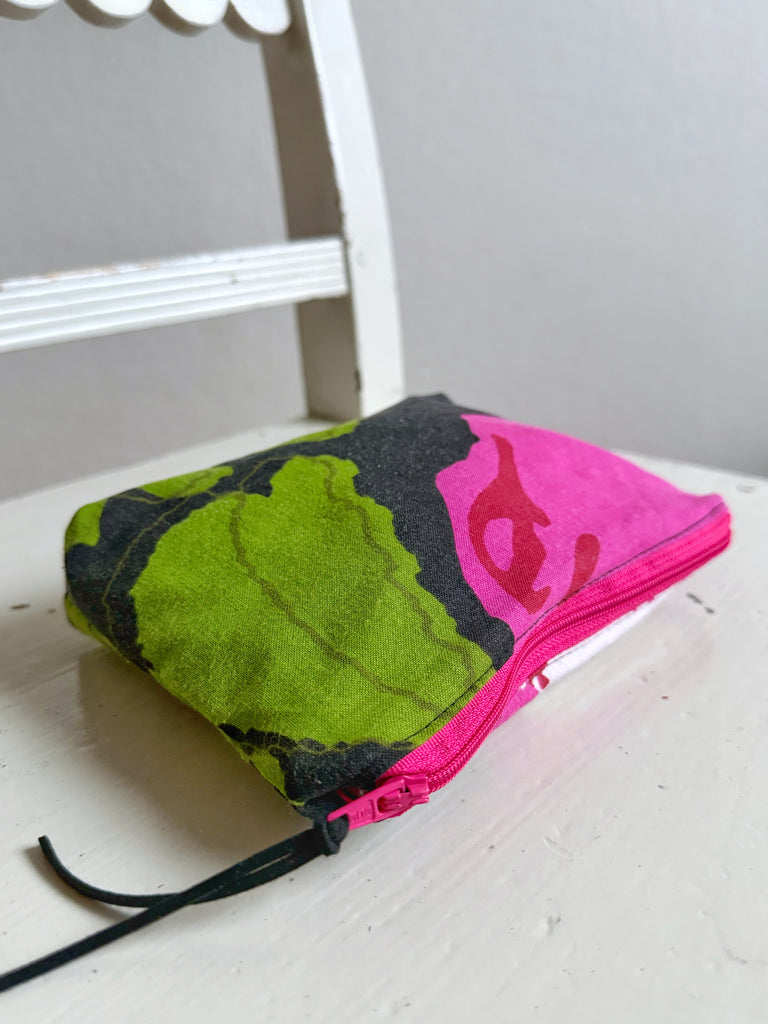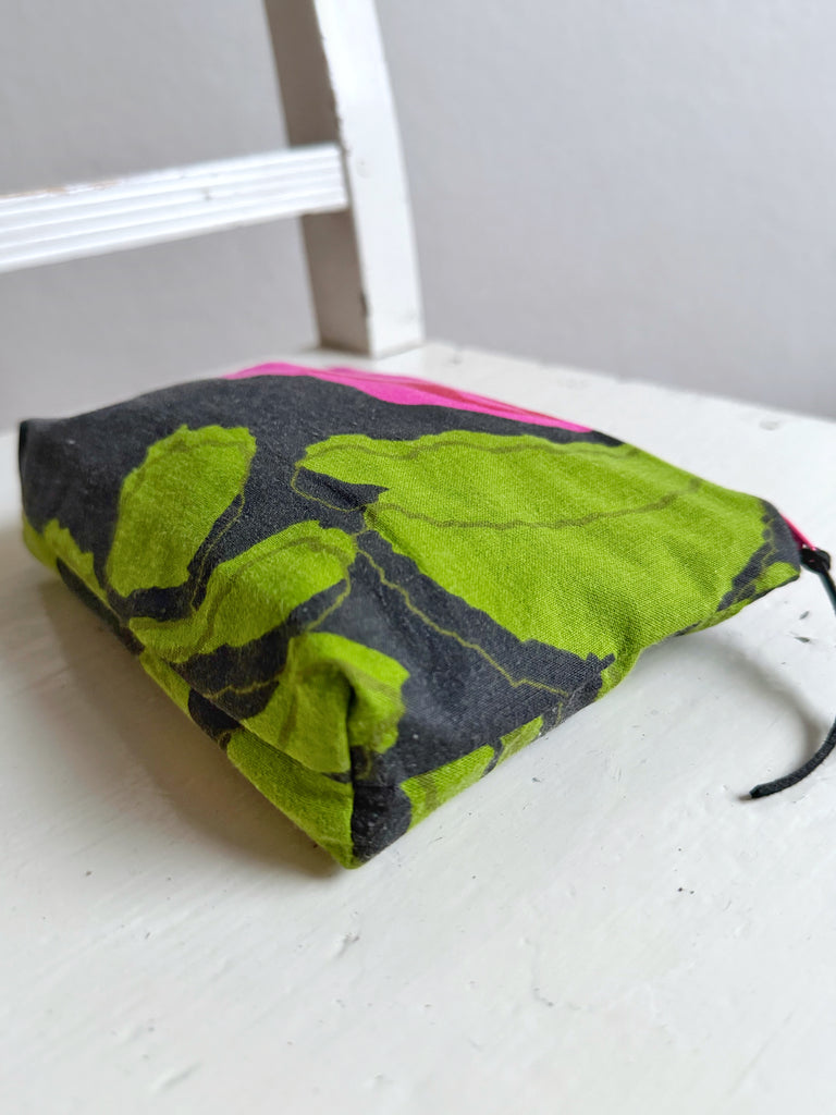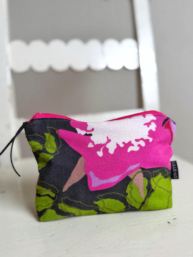 En liten necessär sydd av tygrester från min produktion som förtjänade ett eget liv. Varje necessär blir unik, med sin egen kombination av färg och mönster. Denna har en mörk botten med stora cerise blommor. Mönsterpassningen kan skilja sig från bilden.