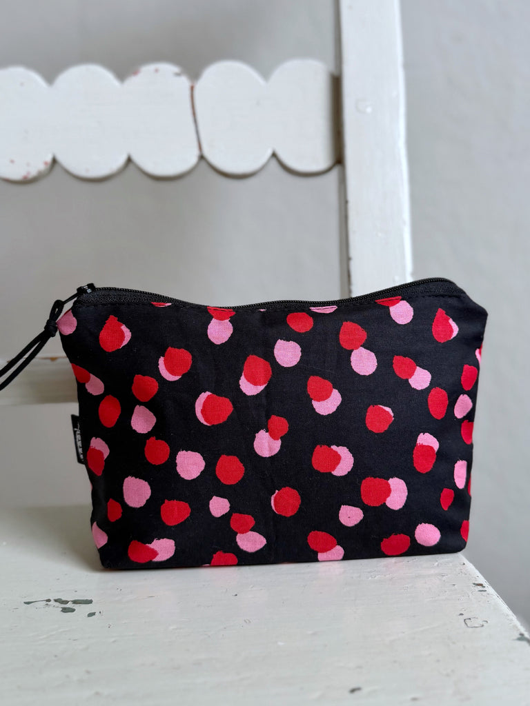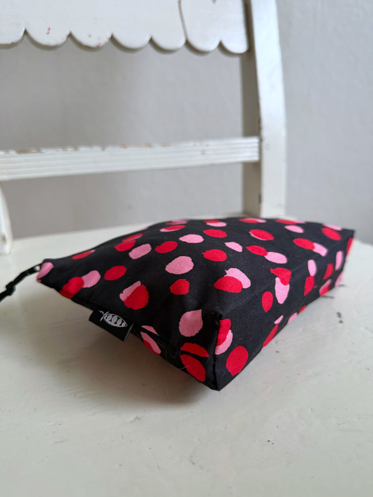 En liten necessär sydd av tygrester från min produktion som förtjänade ett eget liv. Varje necessär blir unik, med sin egen kombination av färg och mönster. Denna har svart botten med prickar i rosa och rött.