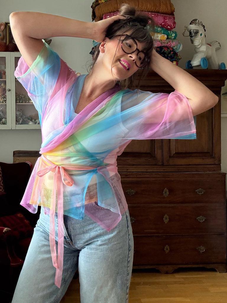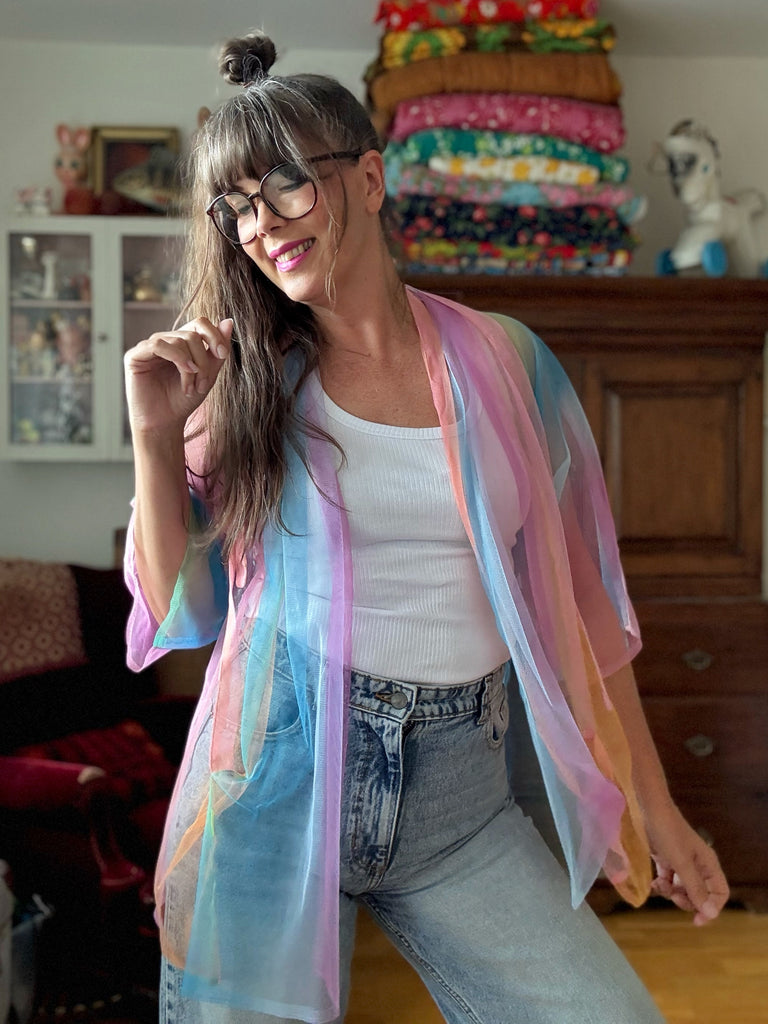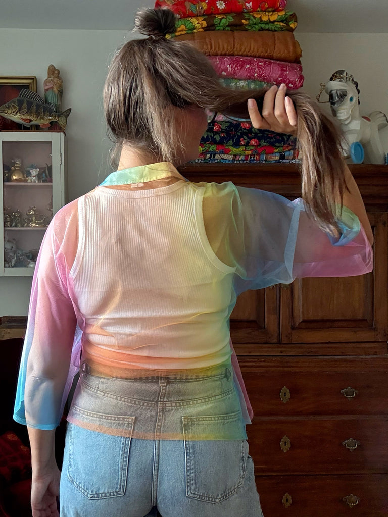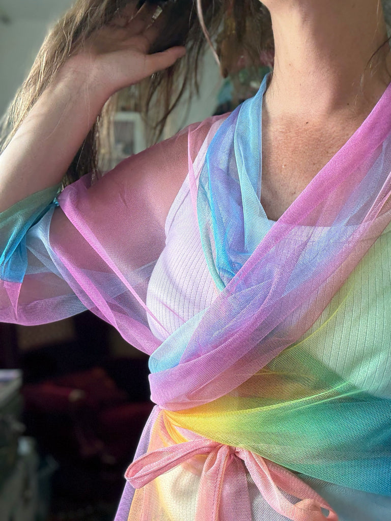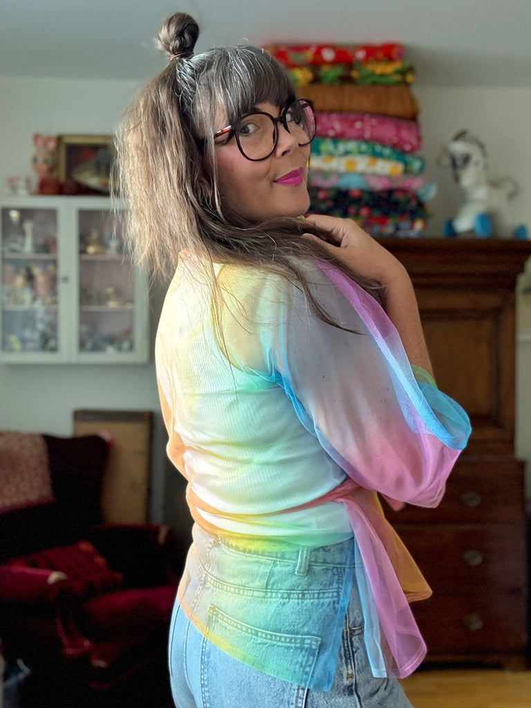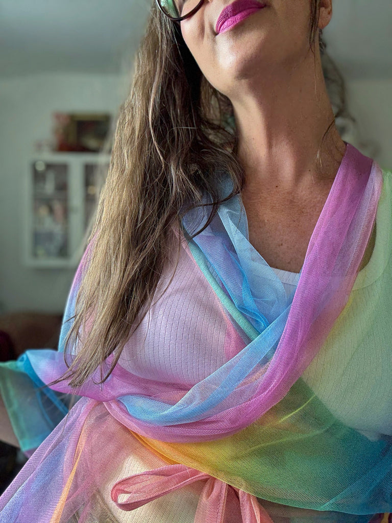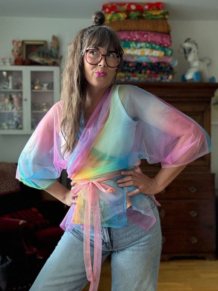 Denna blus är i ljuvlig mjuk tyll. Lätt som ett moln och i regnbågens färger.