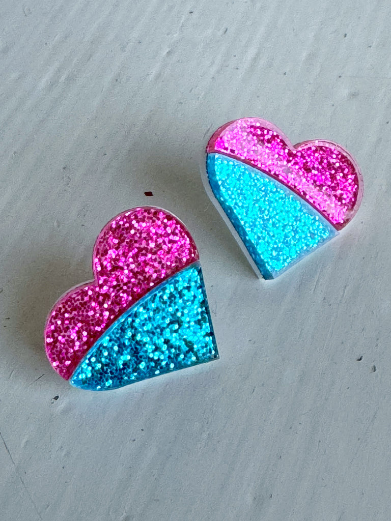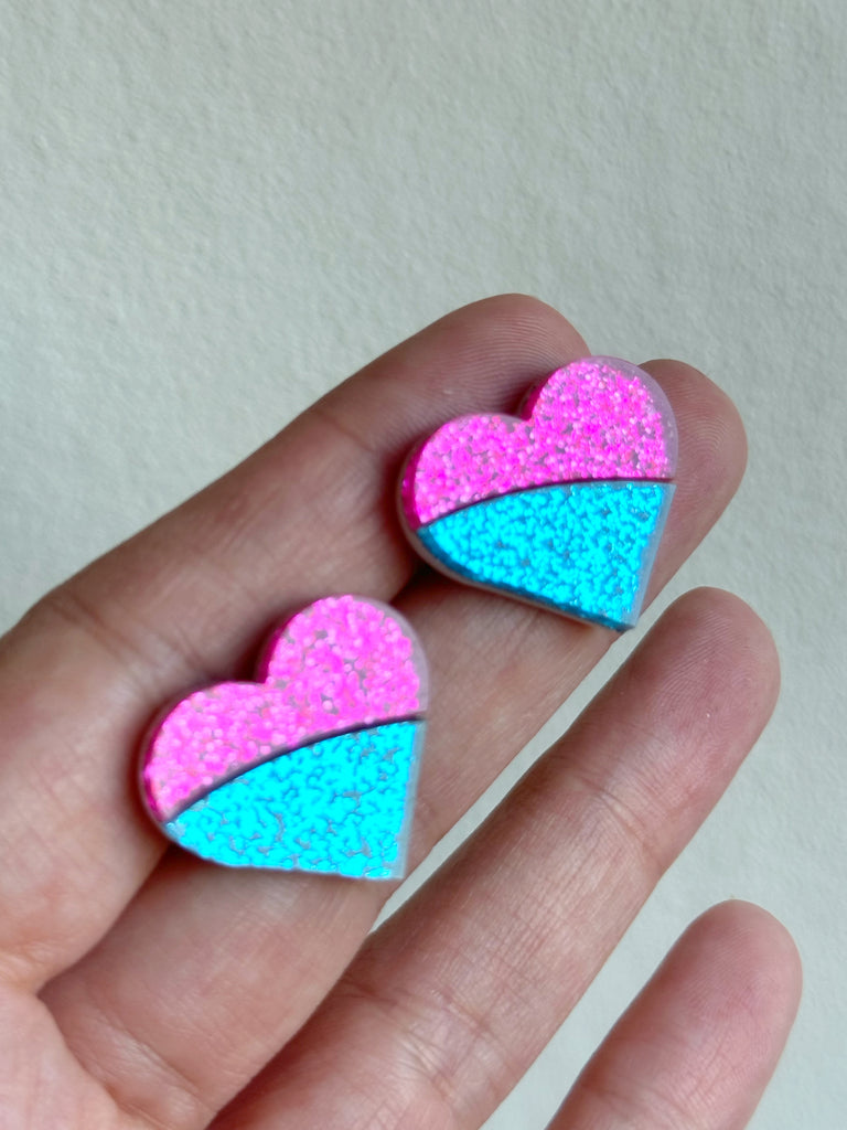 Dessa är hjärtan med stift direkt i örat. De är i cerise och turkost glitter.