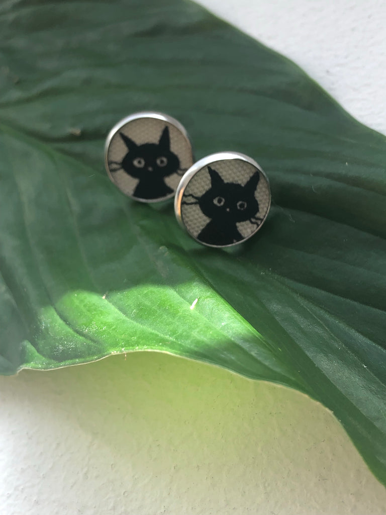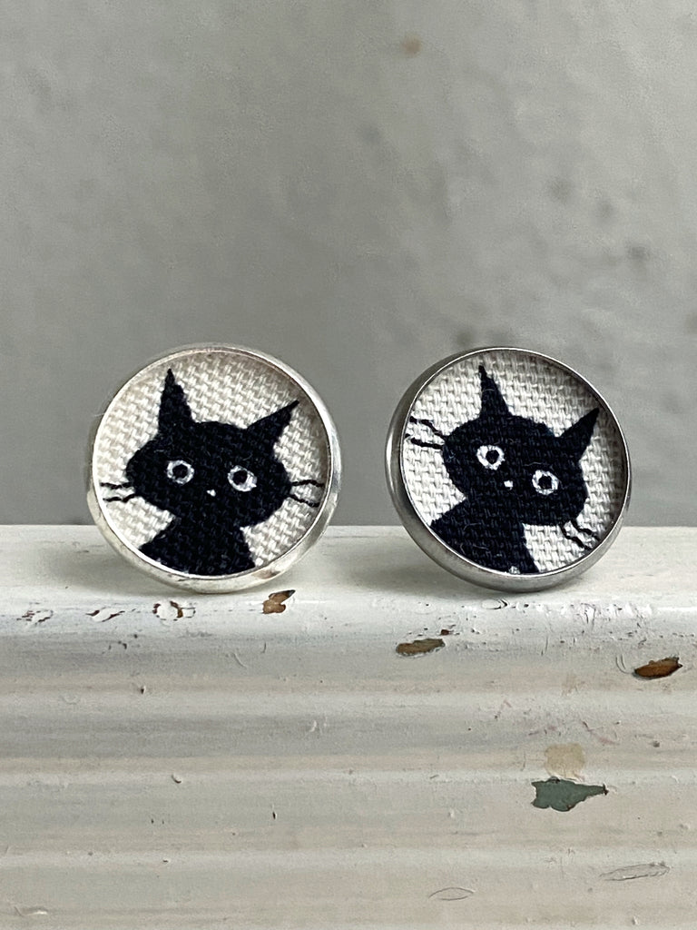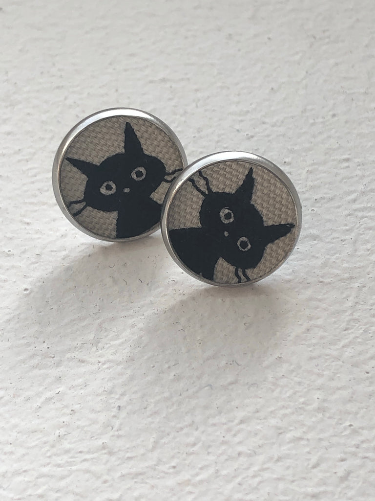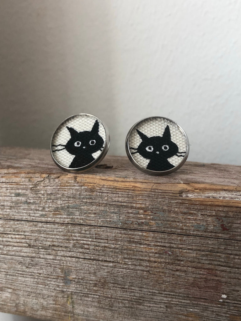 En svart liten katt av tyg som sitter i en liten ram. Själva örhänget är 14 mm.