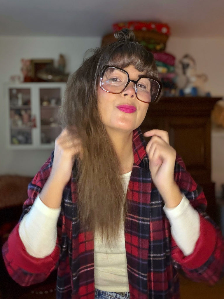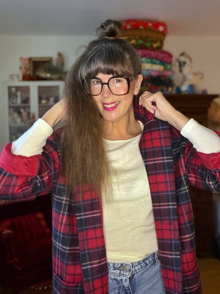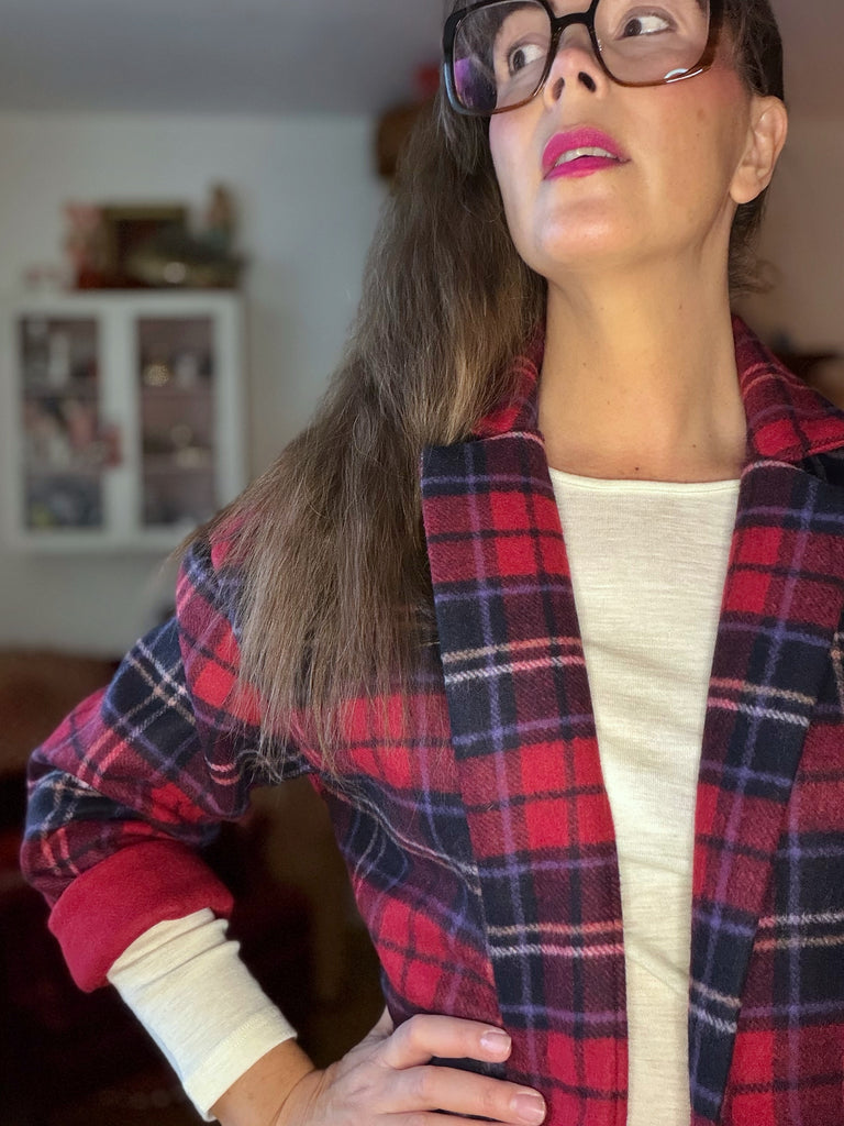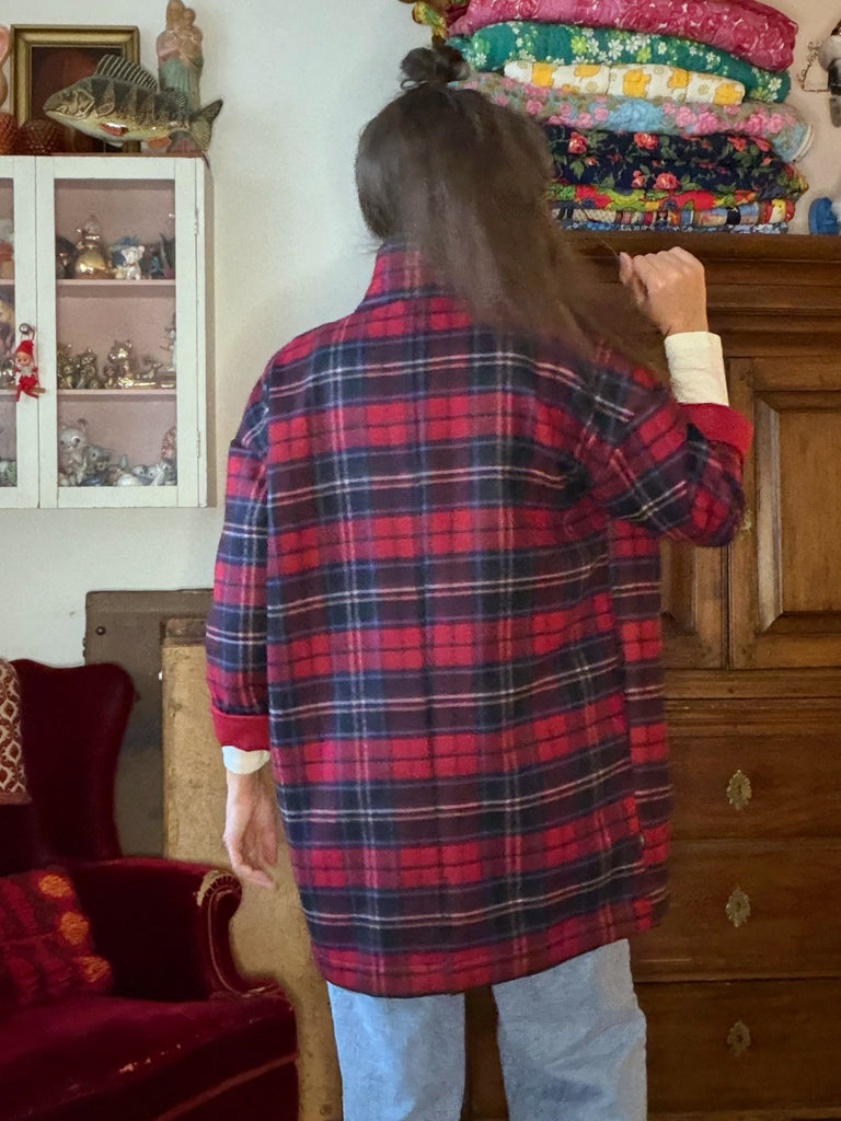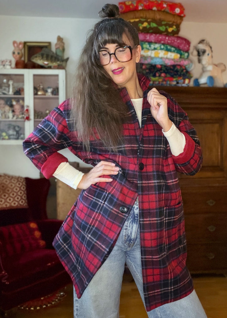 Otrologt härlig med röd botten och ett rutigt mönster. Tyget är deadstock. Du kan knäppa den med två större knappar, de kan dock skilja sig från bilden då de flesta är loppisfynd.