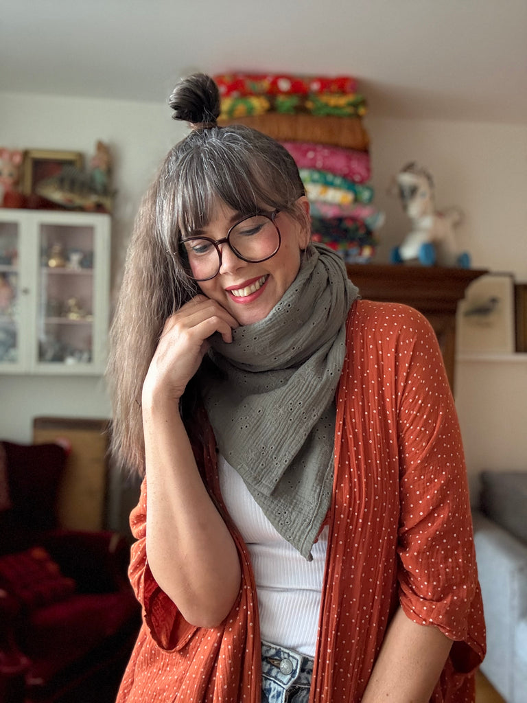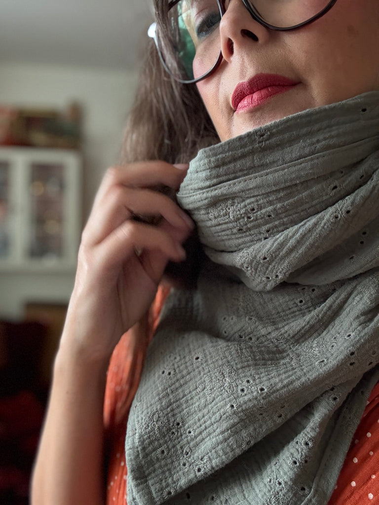 Här hittar du faktiskt en enfärgad olivgrön sjal. Men den har vackert broderi över hela så väldigt effektfull.