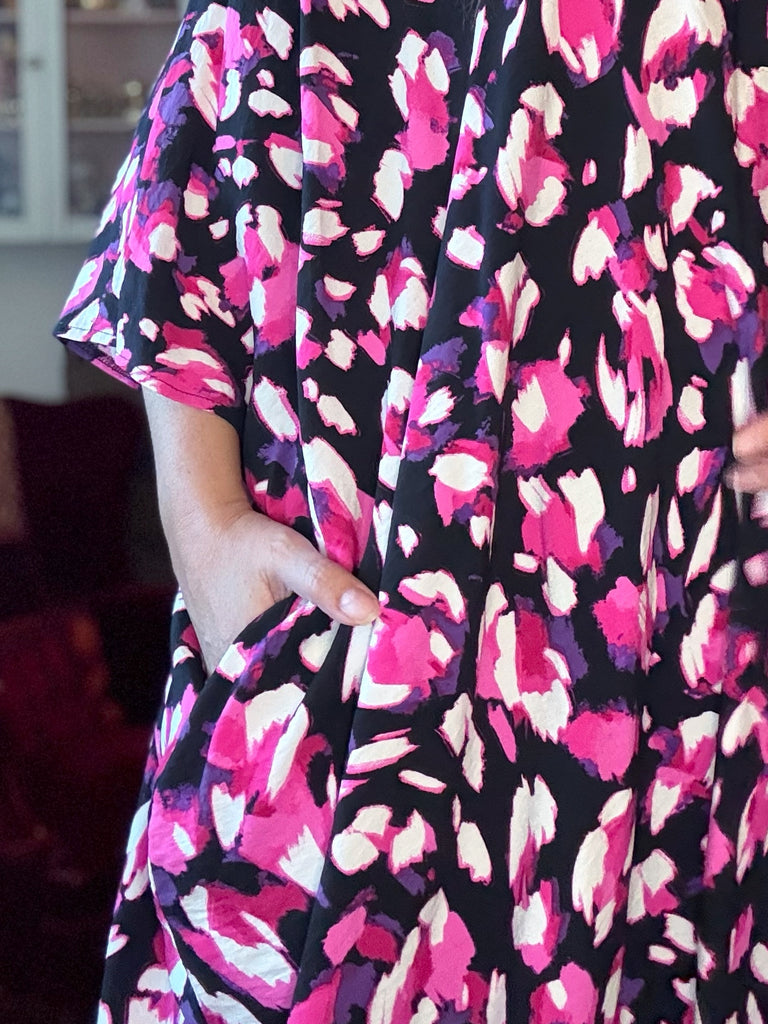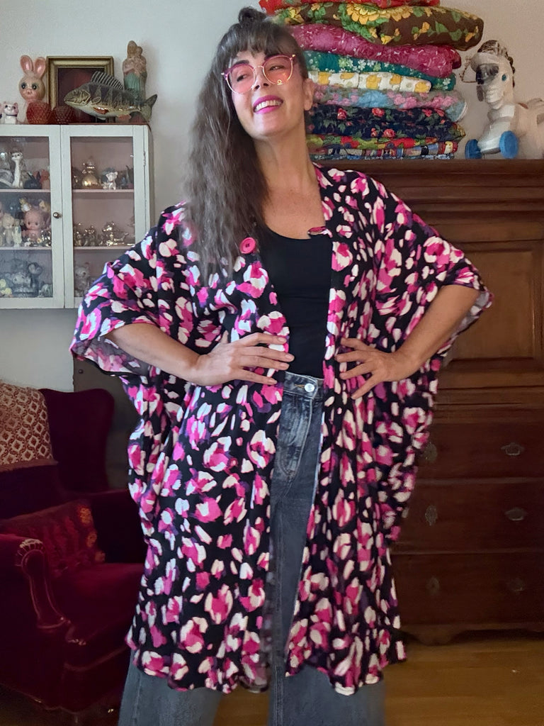 Leopardmönster i cerise och lila på svart botten. Tyget är en lite bubblig viskos.