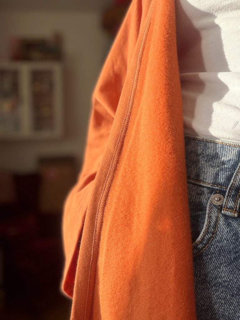 Tyget är ett collagetyg, ett lite kraftigare jerseytyg, med en borstad len insida. Detta sjok är i en ljus tegel eller rostfärg. En vacker varm nyans som är lättmatchad med andra färger. Det är dessutom ekologiskt och gots-märkt.