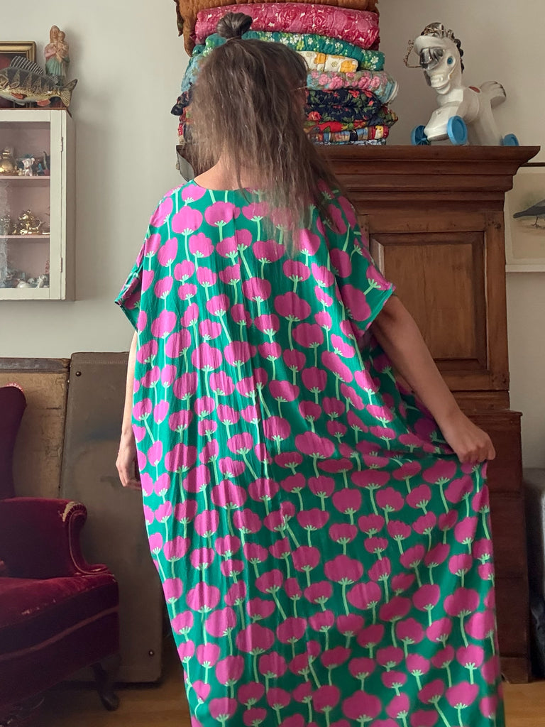 Grön botten med stora cerisa blommor. Kalla nyanser skulle jag säga. Tunn sval viskos med en slät och sval yta.