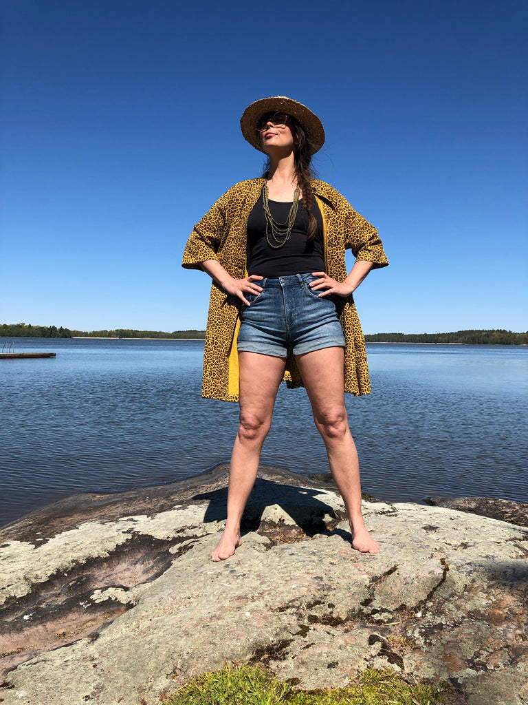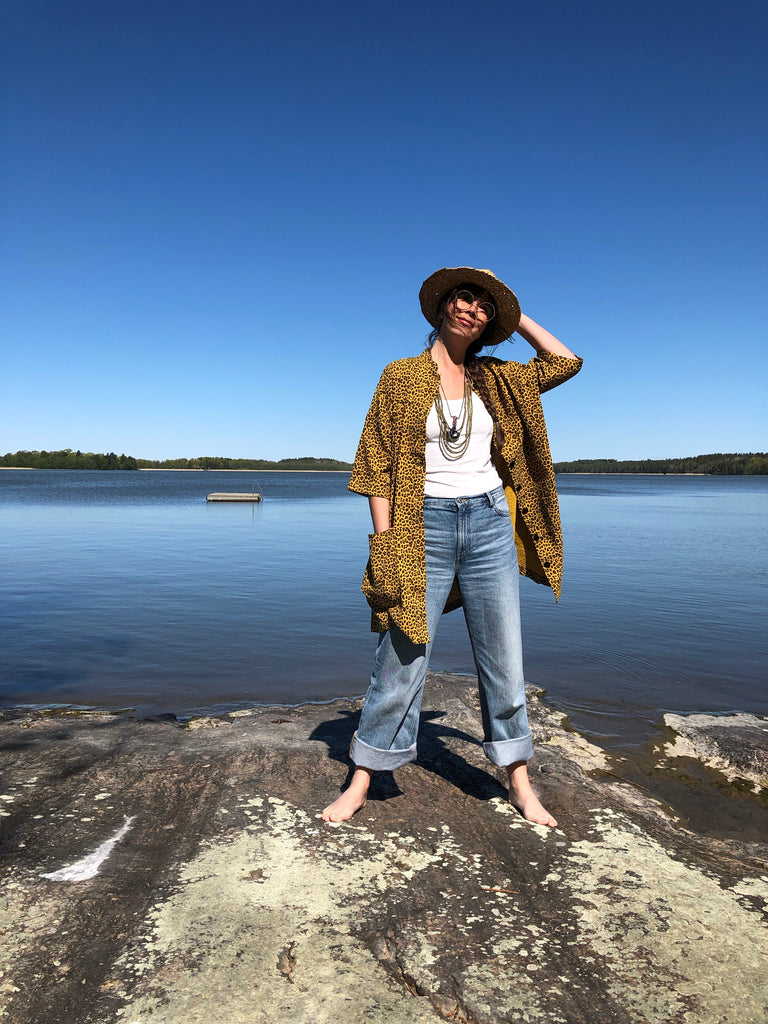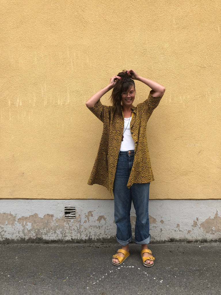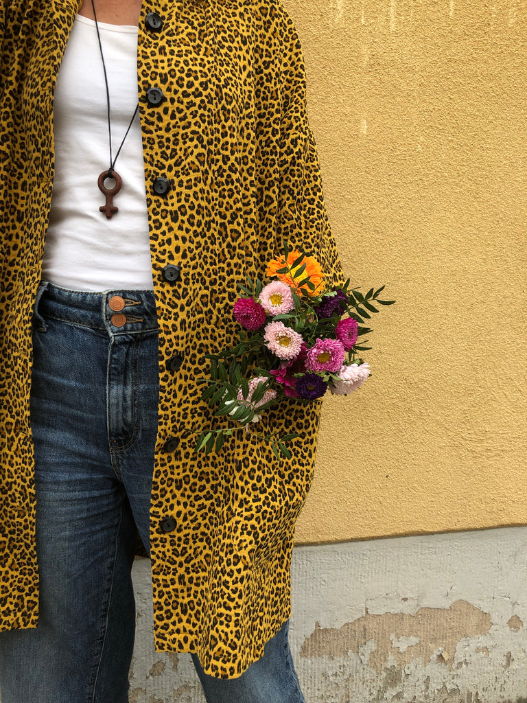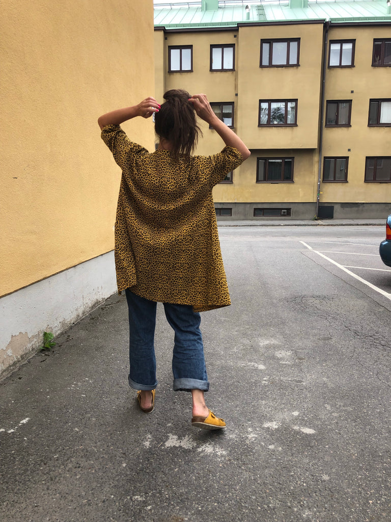 Den här städrocken är sydd i ett underbart leopardmönstrat tyg. Jag fullkomligt älskar leopardmönster, speciellt dessa med gul botten. Den gula färgen är riktigt fin, varm och mustig. Tyget är mjukt men har samtidigt bra styrsel. Muslin i 100% bomull med en fin struktur.
