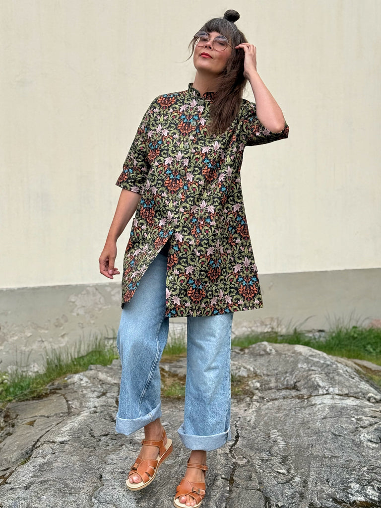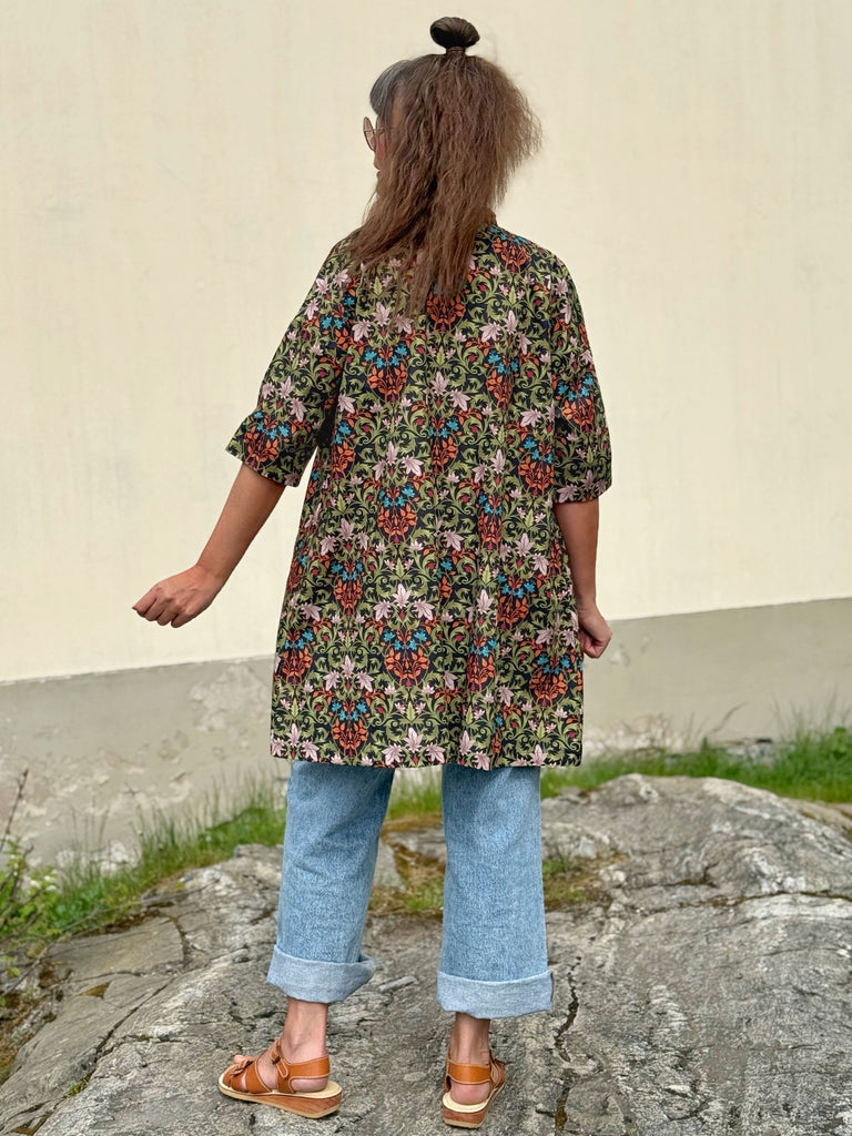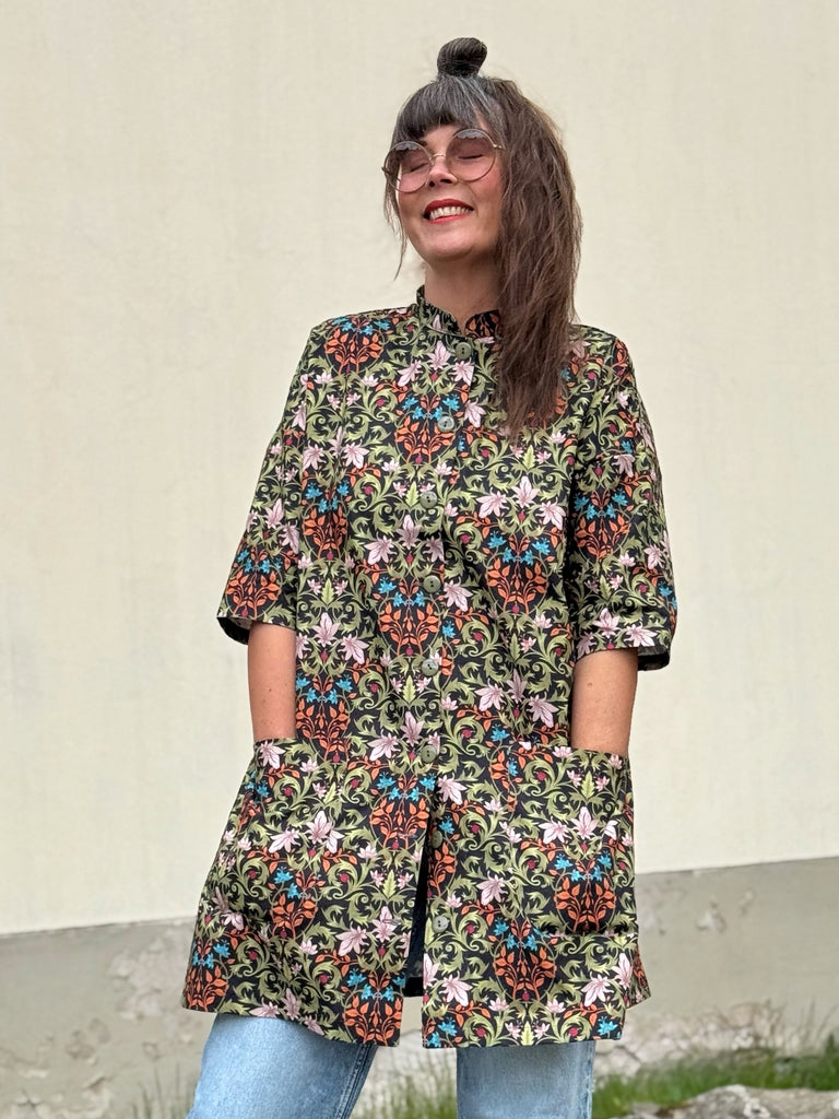 Underbar bekväm och användbar tunika eller städrock som jag kallar den. Den är i en generös rymlig modell med liten ståkrage. Knappar hela vägen fram och stora fickor som du får plats med allt du behöver i.