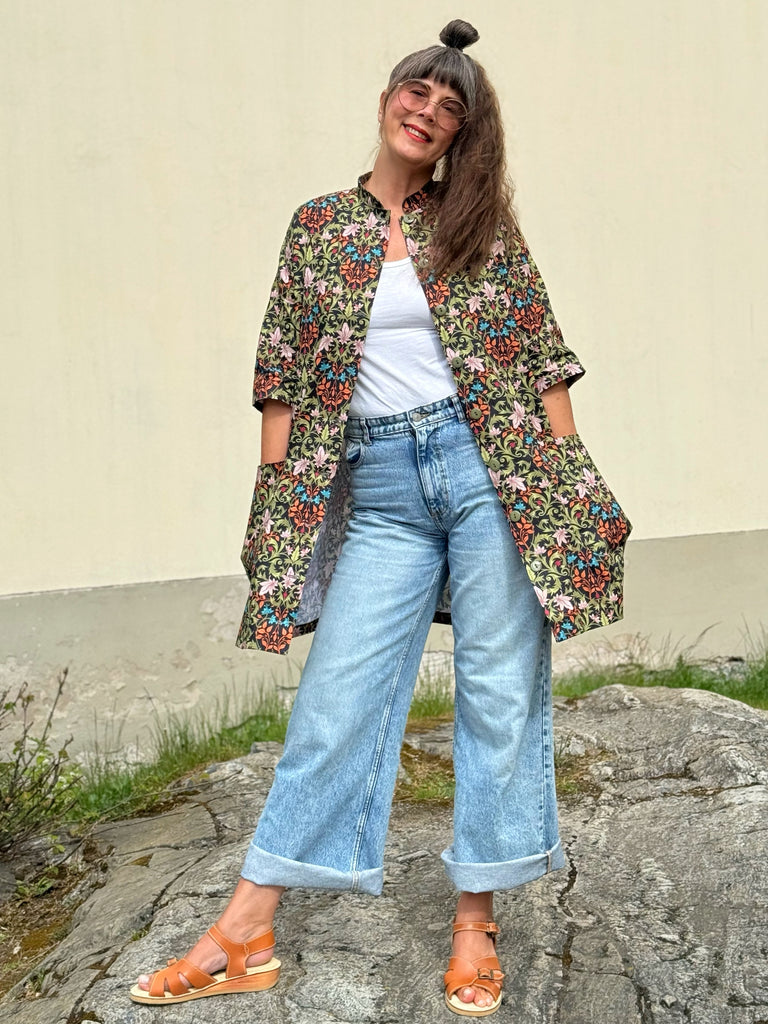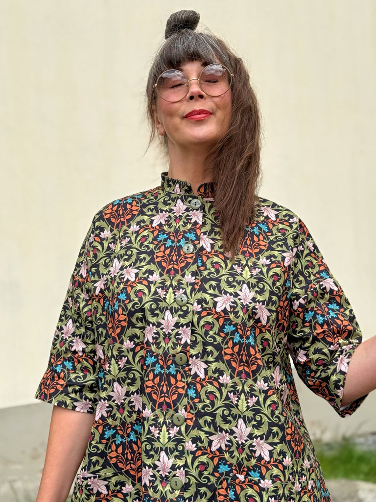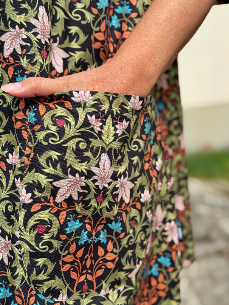 Den här städrocken har ett otroligt vackert mönster som påminner om Wiliam Morris design. Svart botten med ett mönster i lite medaljong-stil. Fin harmoni i färgerna som är mest grönt, rost och blått. Tyget är en härlig lite grövre bomullcanvas som har en vacker struktur utan att bli stel.