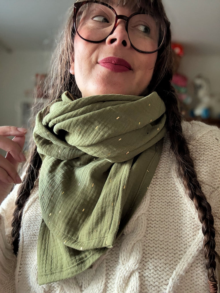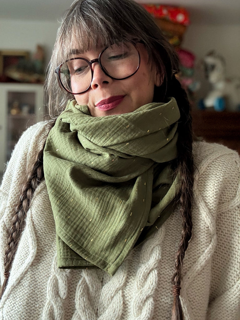 Här hittar du en härlig mossgrön sjal med guld strössel på. De glittriga är bara på ena sidan av sjalen men bidrar till en fin effekt när den används. Tvättas före användning för att fixera guldet.
