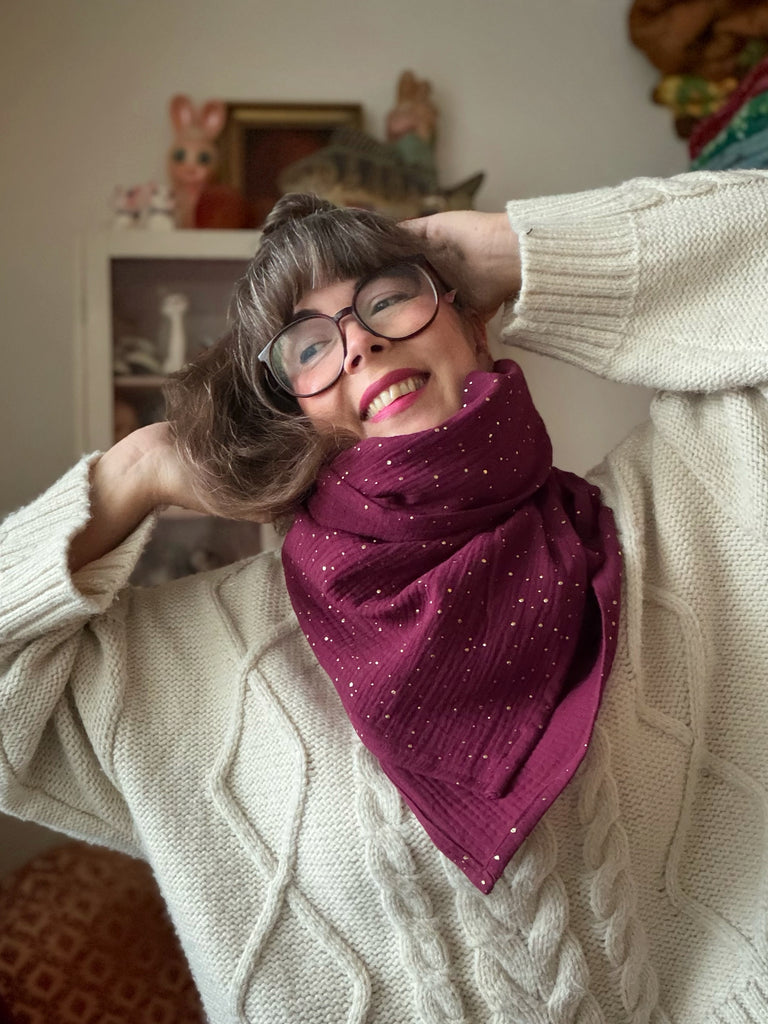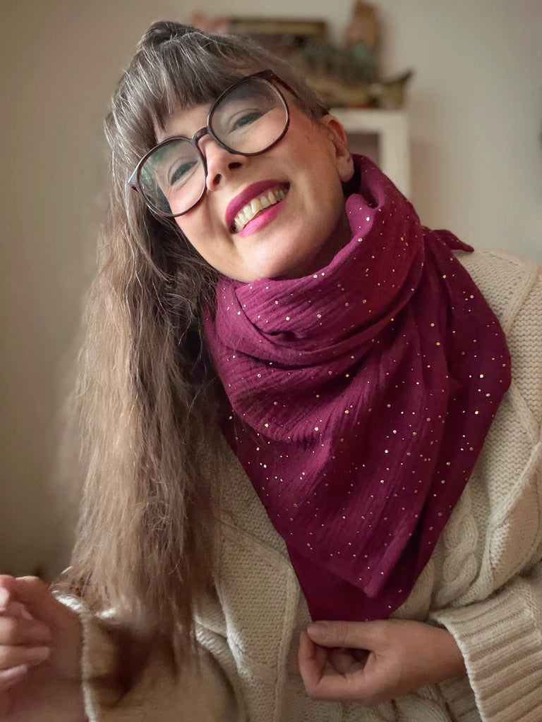 Här hittar du en vackert vinröd sjal med guldiga glitterprickar på. De glittriga är bara på ena sidan av sjalen men bidrar till en fin effekt när den används. Tvättas före användning för att fixera guldet. 30 grader fintvätt, lufttorkas.