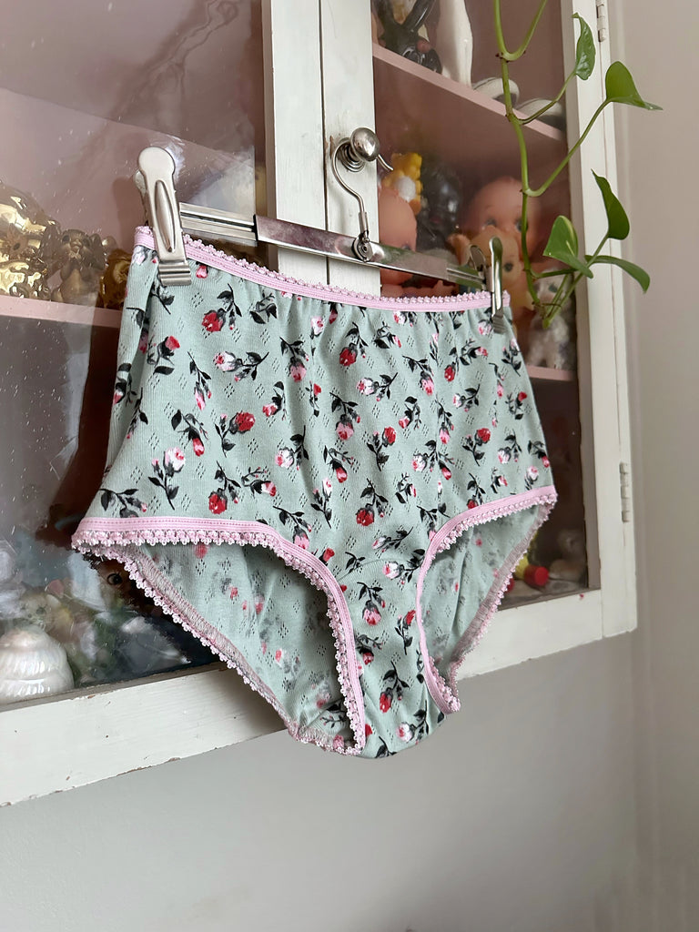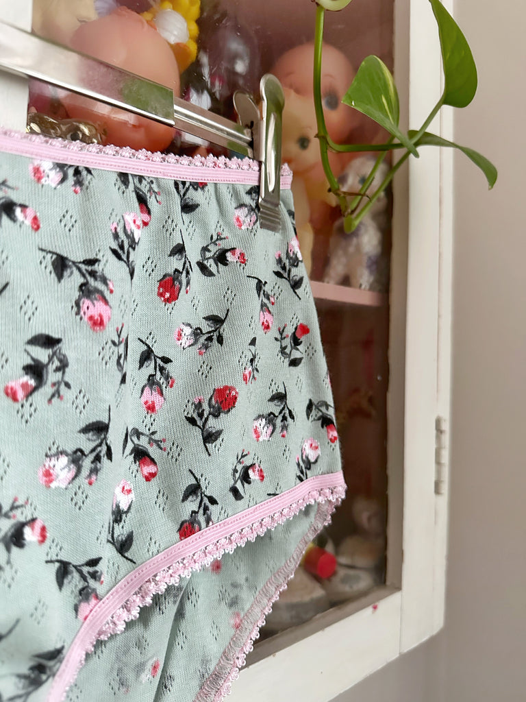 Denna härliga variant av trosan är så himla fin. Klassiskt underklädstyg med små små hålmönster i. Mild grön färg och söta små rosknoppar. Så tidlösa!