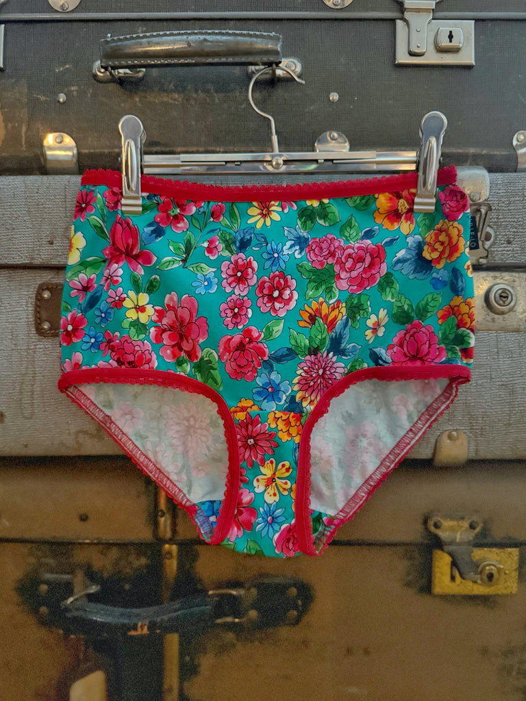 Med de här trollisarna blir ditt liv garanterat färggladare! Massa små blommor i olika färger över hela trosan. Bottenfärgen är grön, nästan lite åt det blå hållet, i en kall nyans. Resåren är röd eller cerise på dessa.